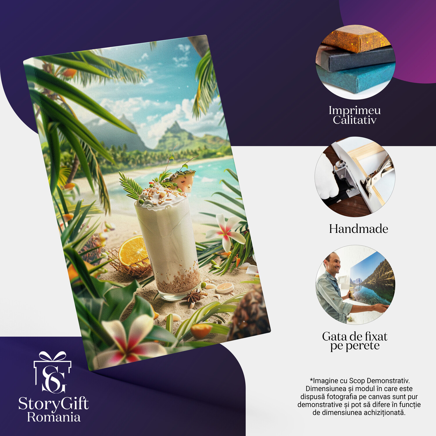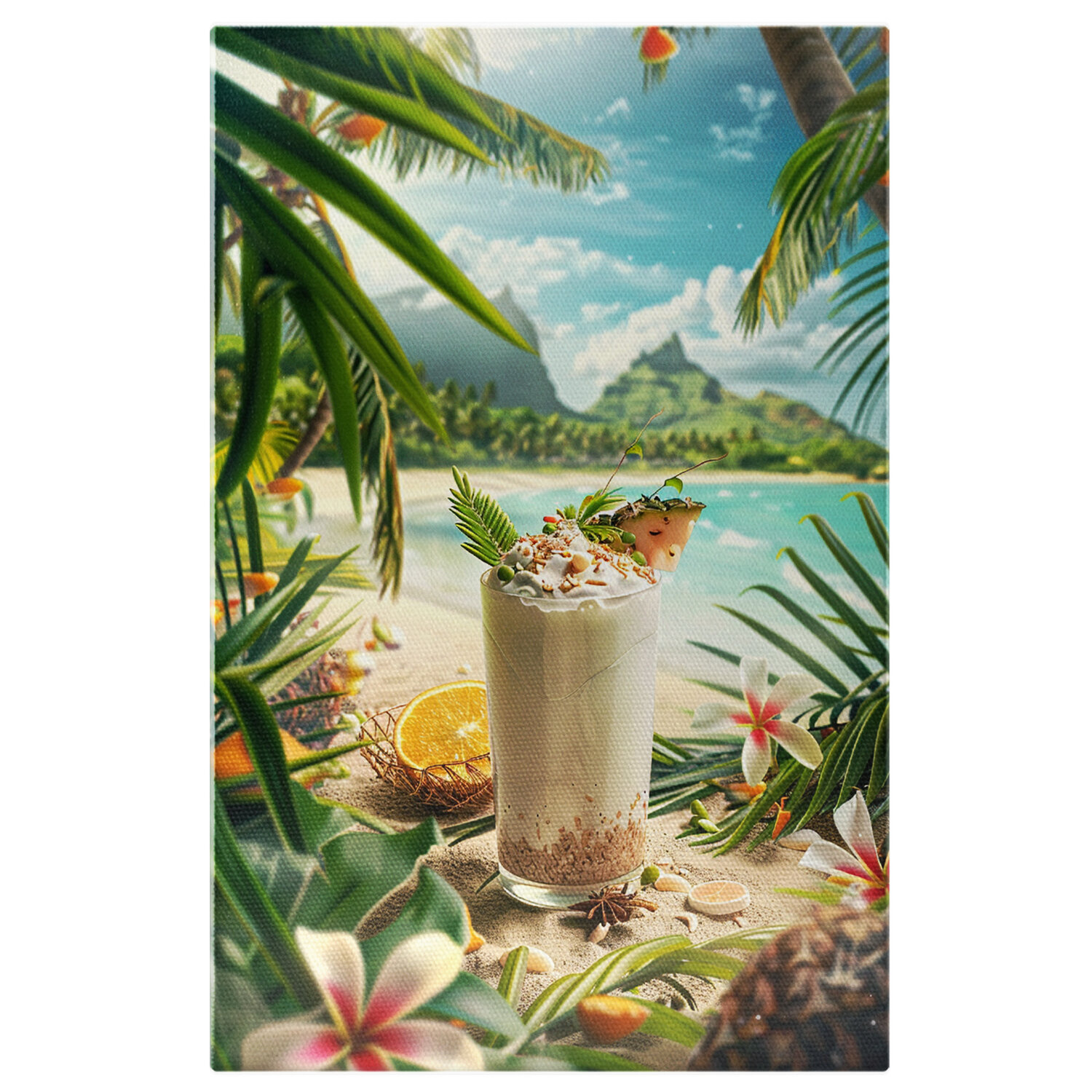 Tablou Canvas Deliciu cu Fructe intr-un Pahar Frumos Decorat pe Plaja Tropicala cu Flori , Pictura Digitala - Tablou Canvas Signature de la StoryGift Romania