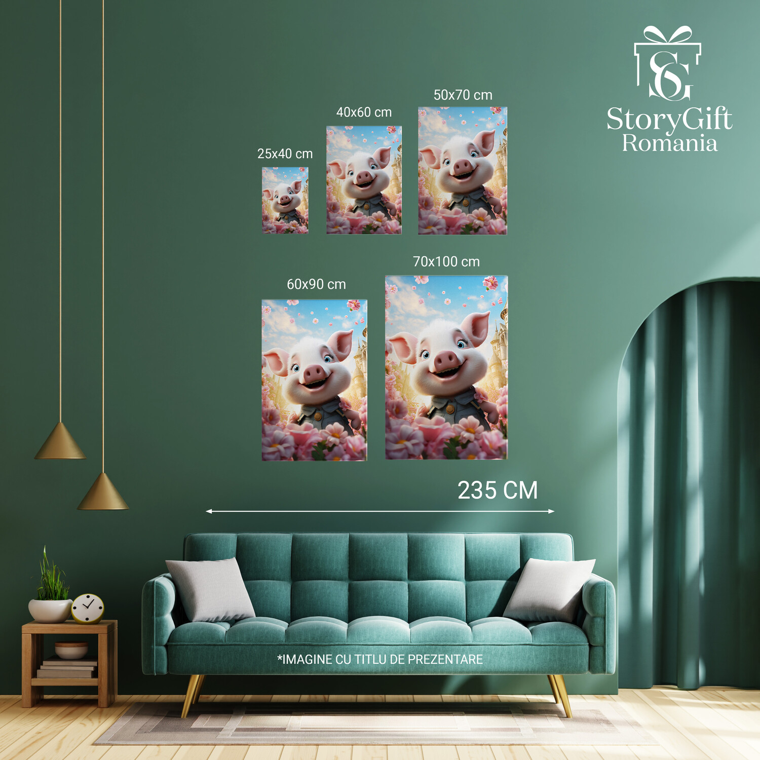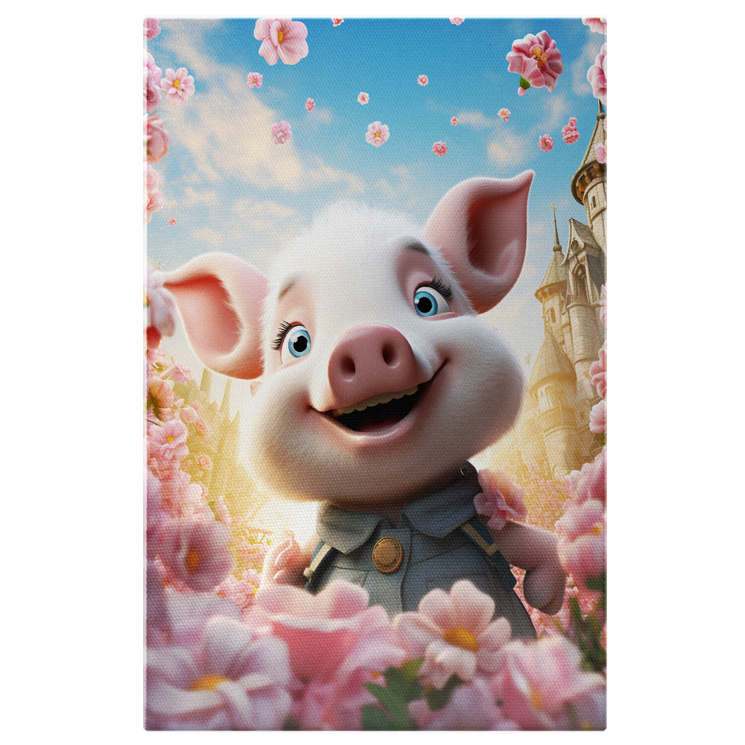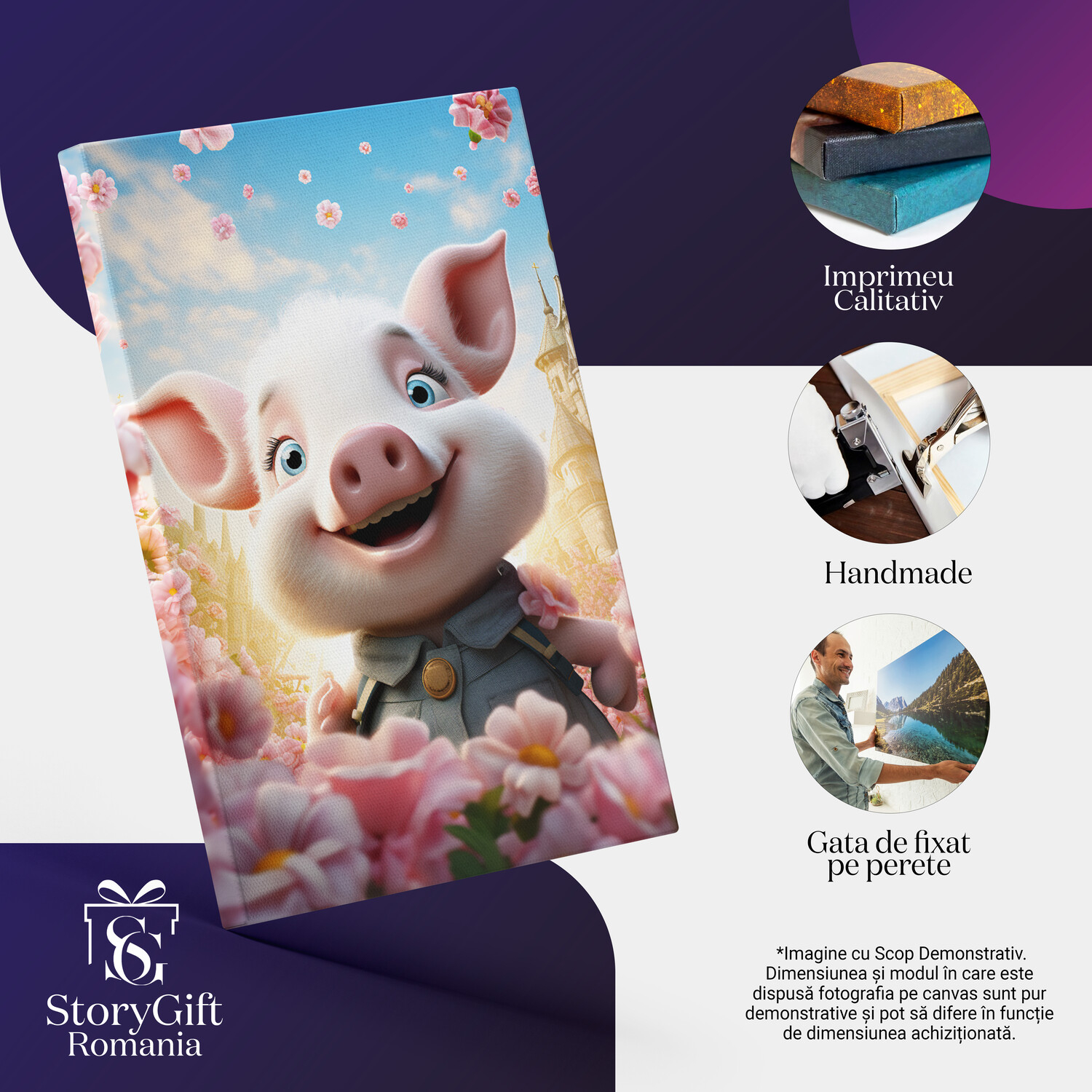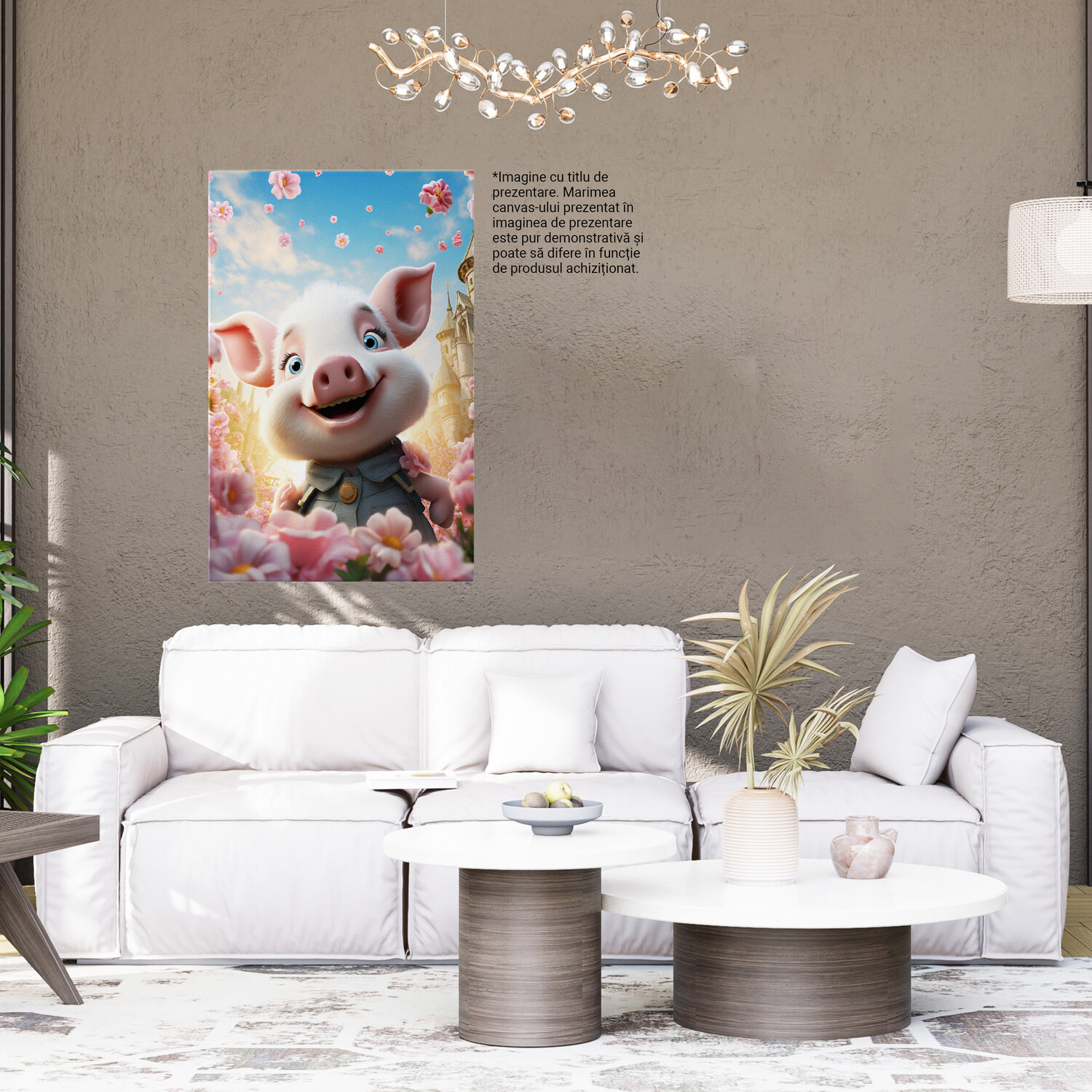 Tablou Canvas: Baby Pig Micuta Purcelusa cu Ochii Stralucitori cu Chipul Fericit si Floricele Roz Imprejur Pictura Digitala - Tablou Canvas Signature de la StoryGift Romania