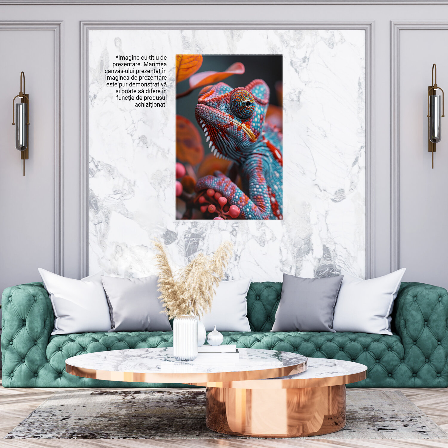 Tablou Canvas Cameleonul Punctat in Nuante de Roz si Albastru Priveste cu Ochii sai Bulbucati , Pictura Digitala 40x25CM