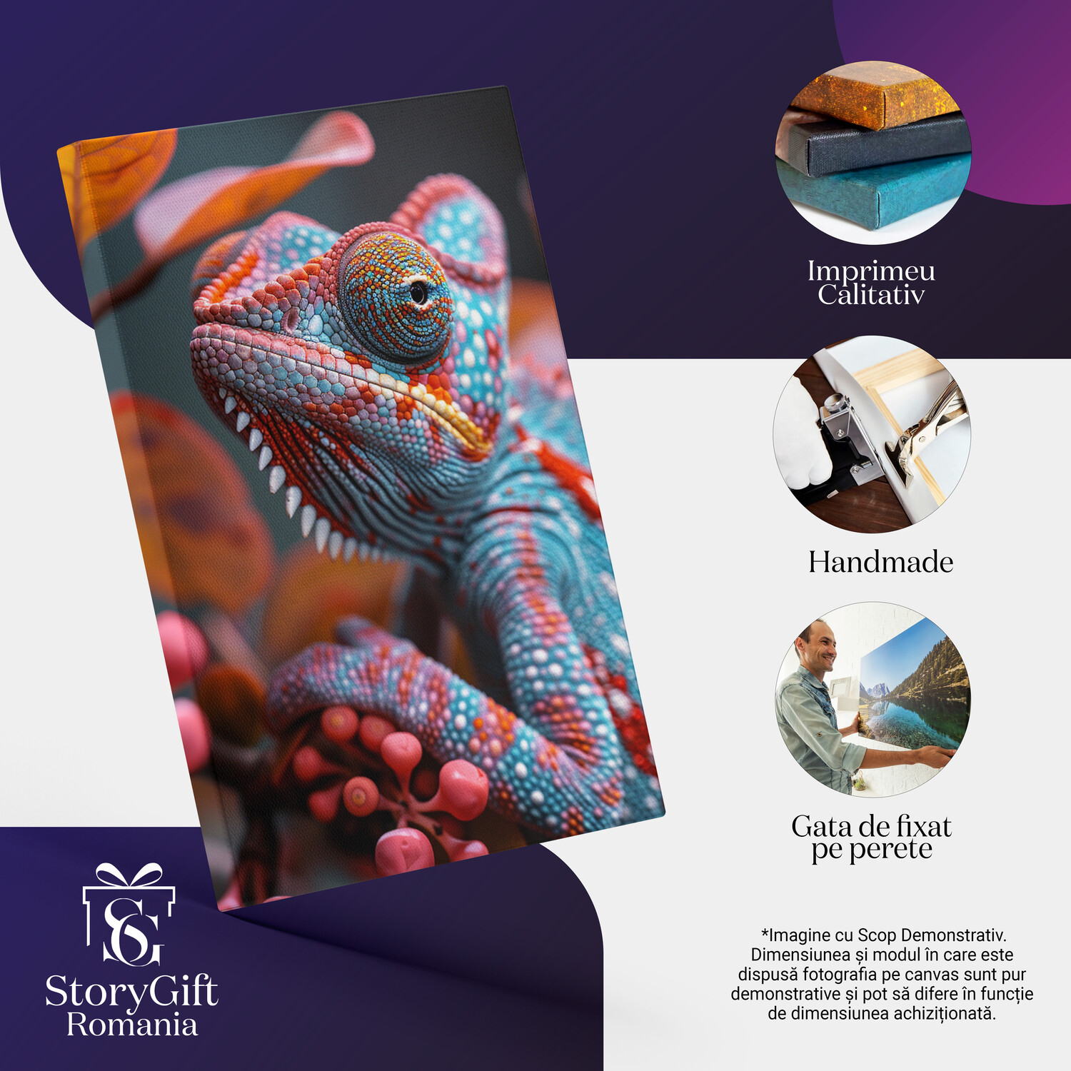Tablou Canvas Cameleonul Punctat in Nuante de Roz si Albastru Priveste cu Ochii sai Bulbucati , Pictura Digitala - Tablou Canvas Signature de la StoryGift Romania