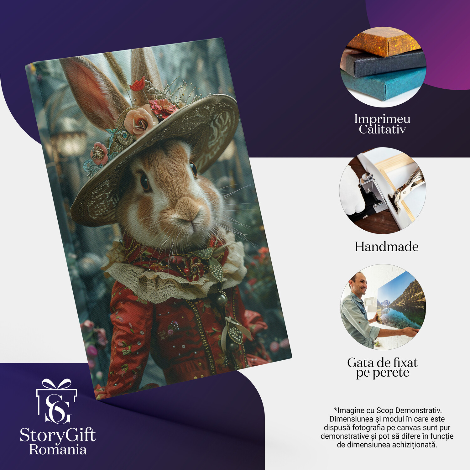 Tablou Canvas Doamna Iepuroaica cu Urechile Ascutite si Palarie cu Flori in Rochie Regala Rosie cu Floricele , Pictura Digitala - Tablou Canvas Signature de la StoryGift Romania