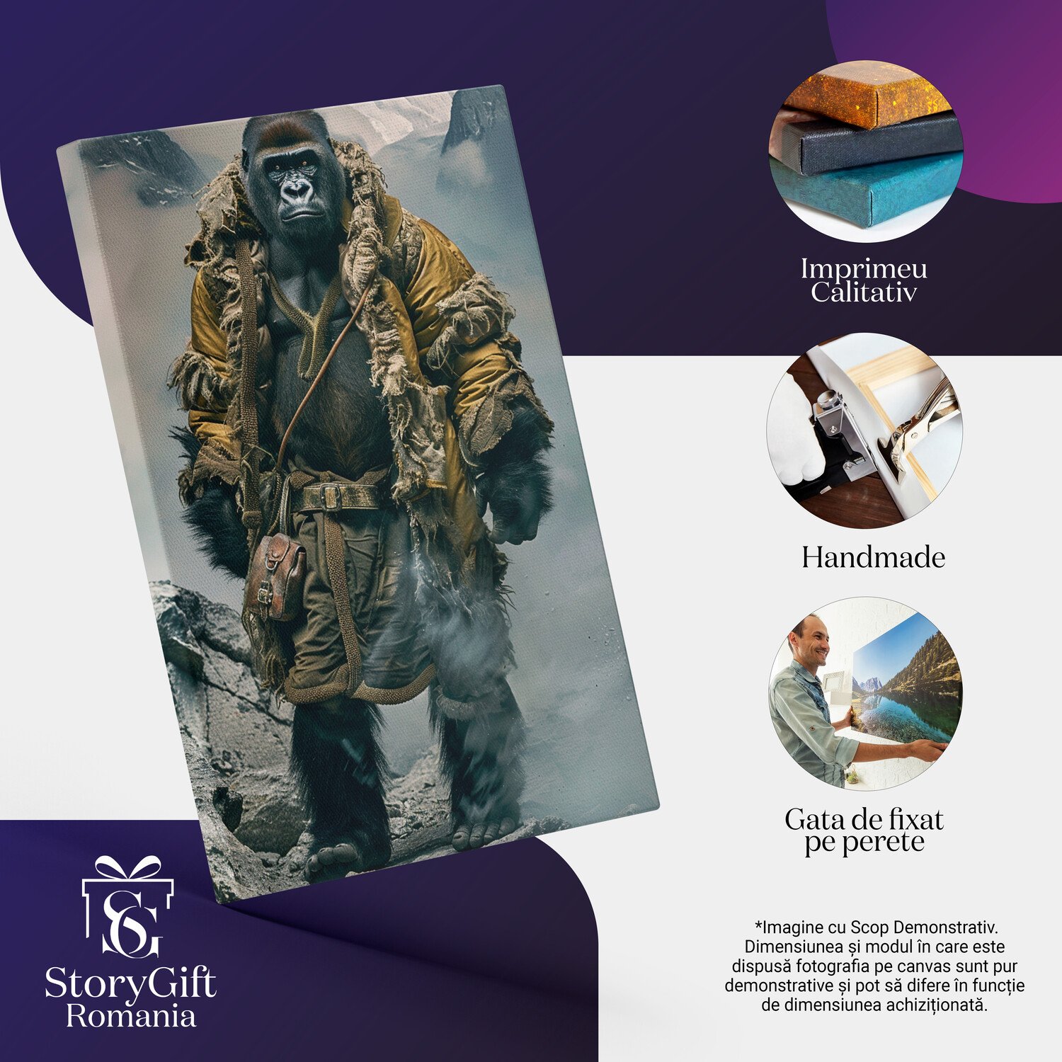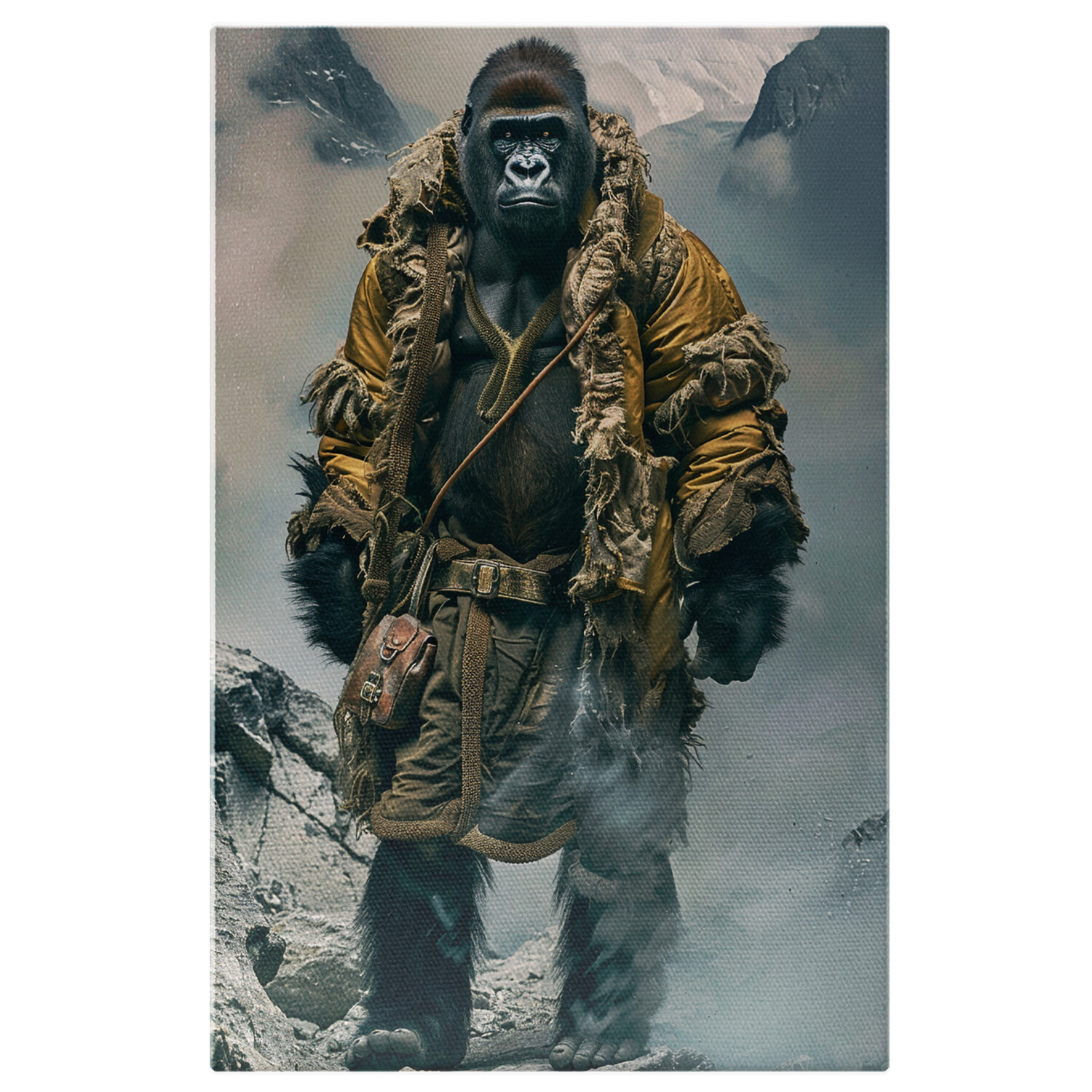 Tablou Canvas Gorila in costum de aplinist - Urcand printre stancile muntilor in jacheta galbena , Pictura Digitala - Tablou Canvas Signature de la StoryGift Romania