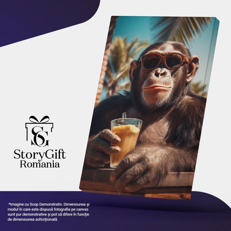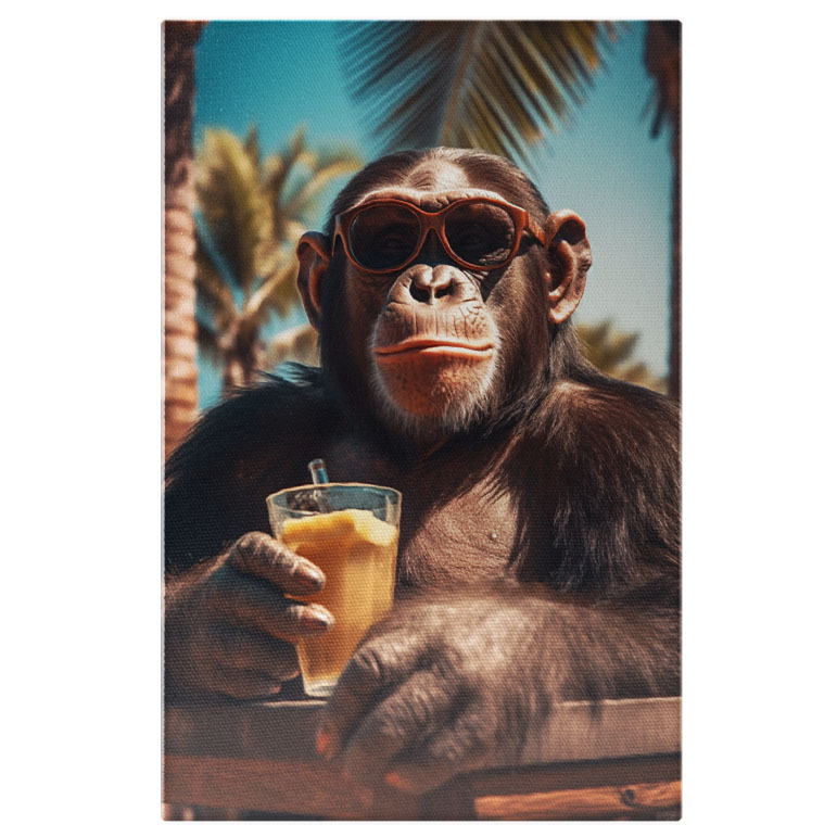 Tablou Canvas: Un cimpanzeu vesel pe plaja - bautura ochelari relaxare Pictura Digitala 40x25CM