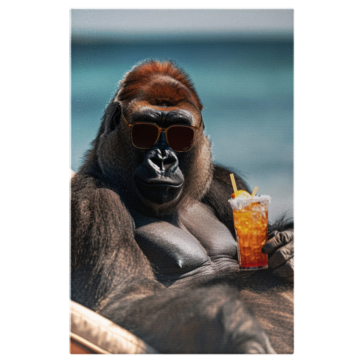 Tablou Canvas La Soare la Bronzat Gorila Cu Ochelari de Soare Surprinsa pe Sezlong cu Un Pahar de suc , Pictura Digitala 90x60CM