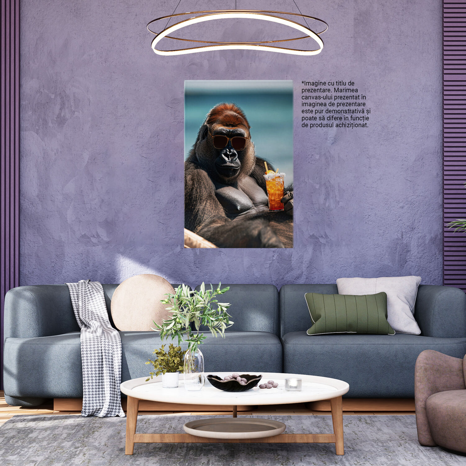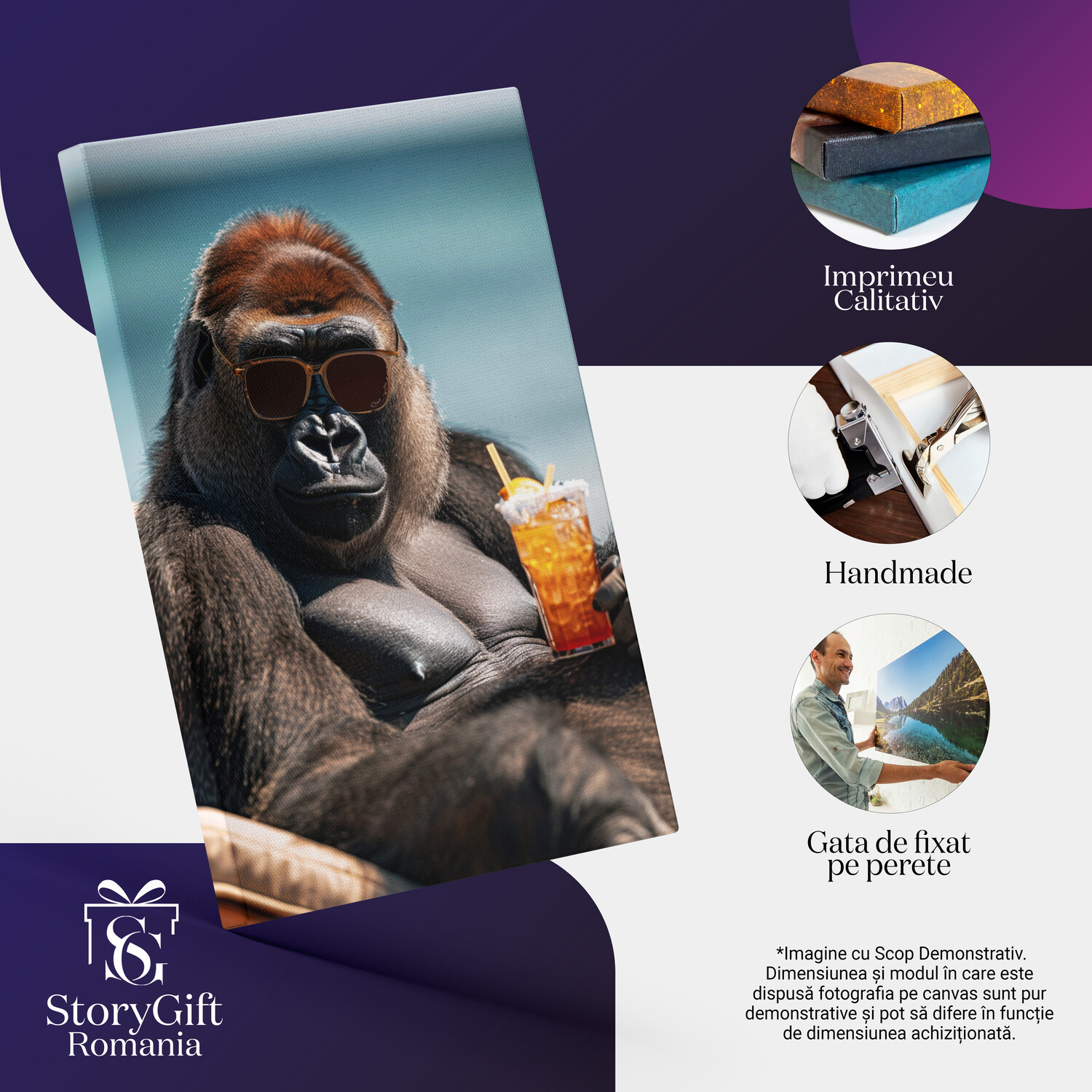 Tablou Canvas La Soare la Bronzat Gorila Cu Ochelari de Soare Surprinsa pe Sezlong cu Un Pahar de suc , Pictura Digitala - Tablou Canvas Signature de la StoryGift Romania