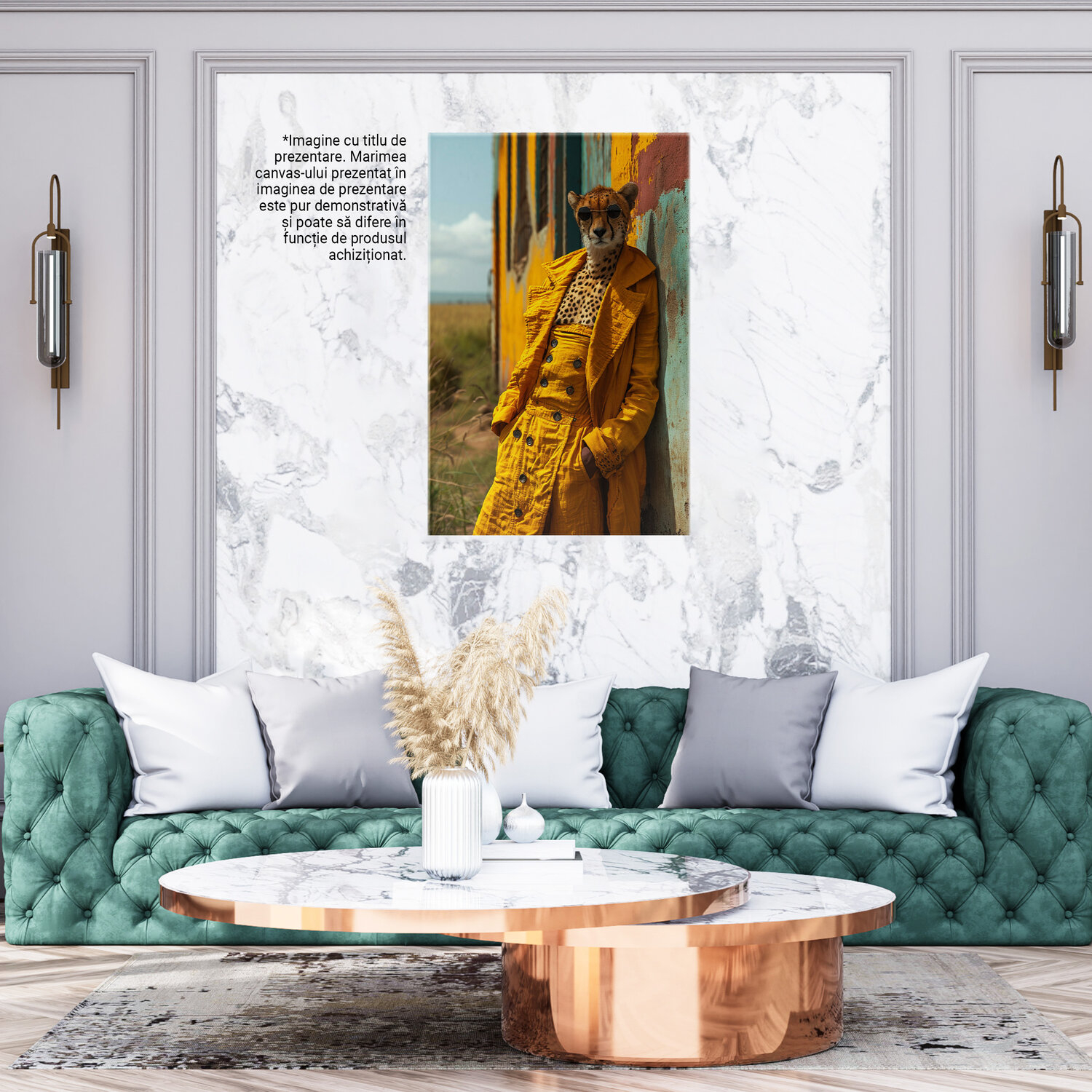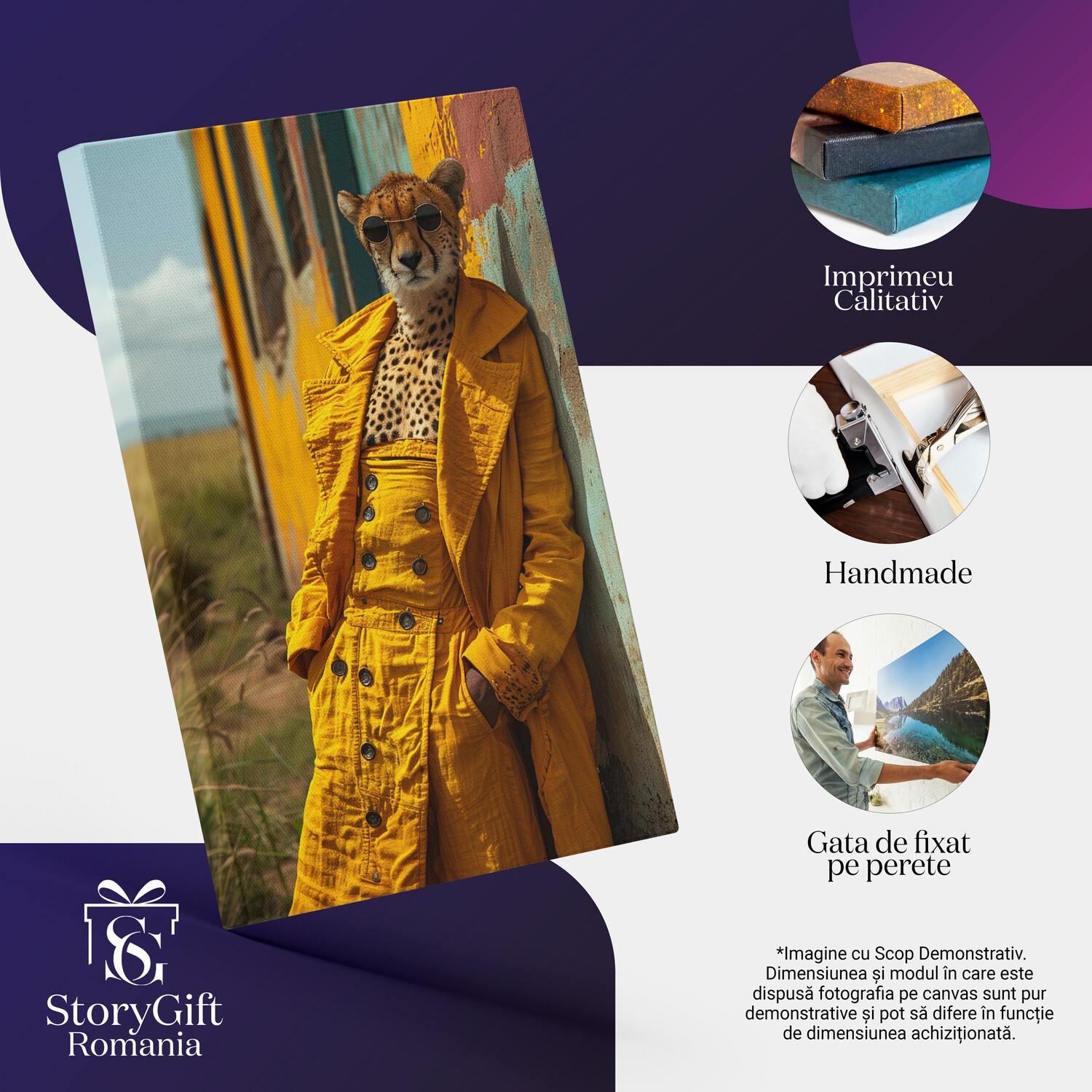 Tablou Canvas Leopard Boss cu Ochelari de Soare Negri si Salopeta Galbena cu Nasturi Sprijinit de un Perete , Pictura Digitala - Tablou Canvas Signature de la StoryGift Romania