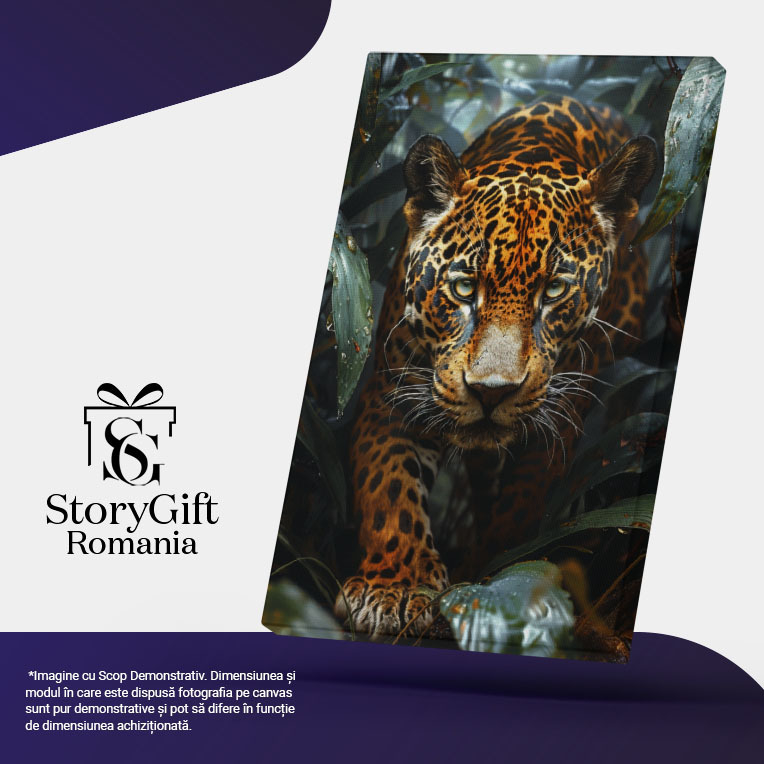 Tablou Canvas Splendoarea Sălbatică Leopardul și Frunzele Udate de Roua din Junglă , Pictura Digitala 40x25CM