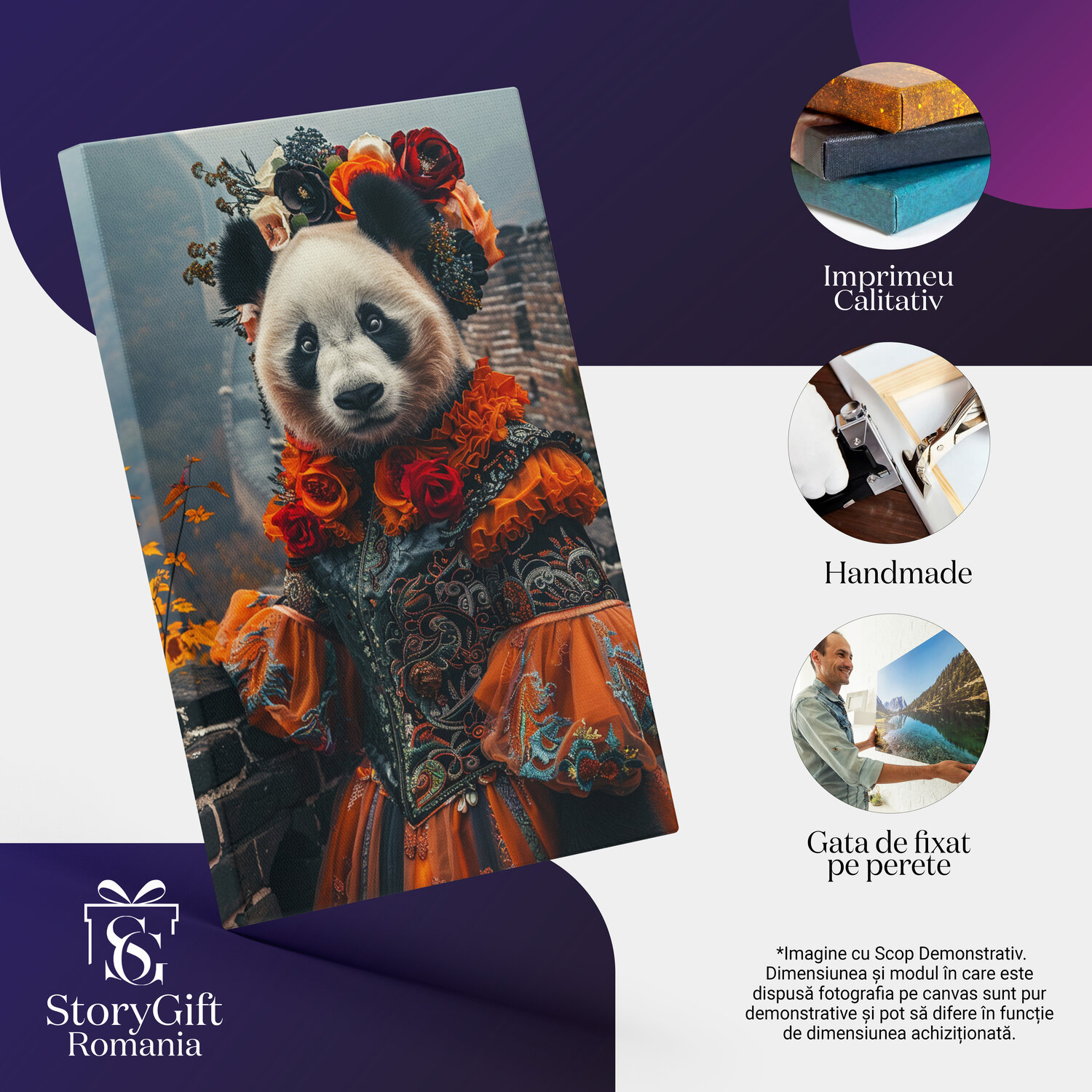 Tablou Canvas Marele Zid Chinezesc pe care se afla Ursoaica Panda cu Coronita si Rochie Portocalie , Pictura Digitala - Tablou Canvas Signature de la StoryGift Romania