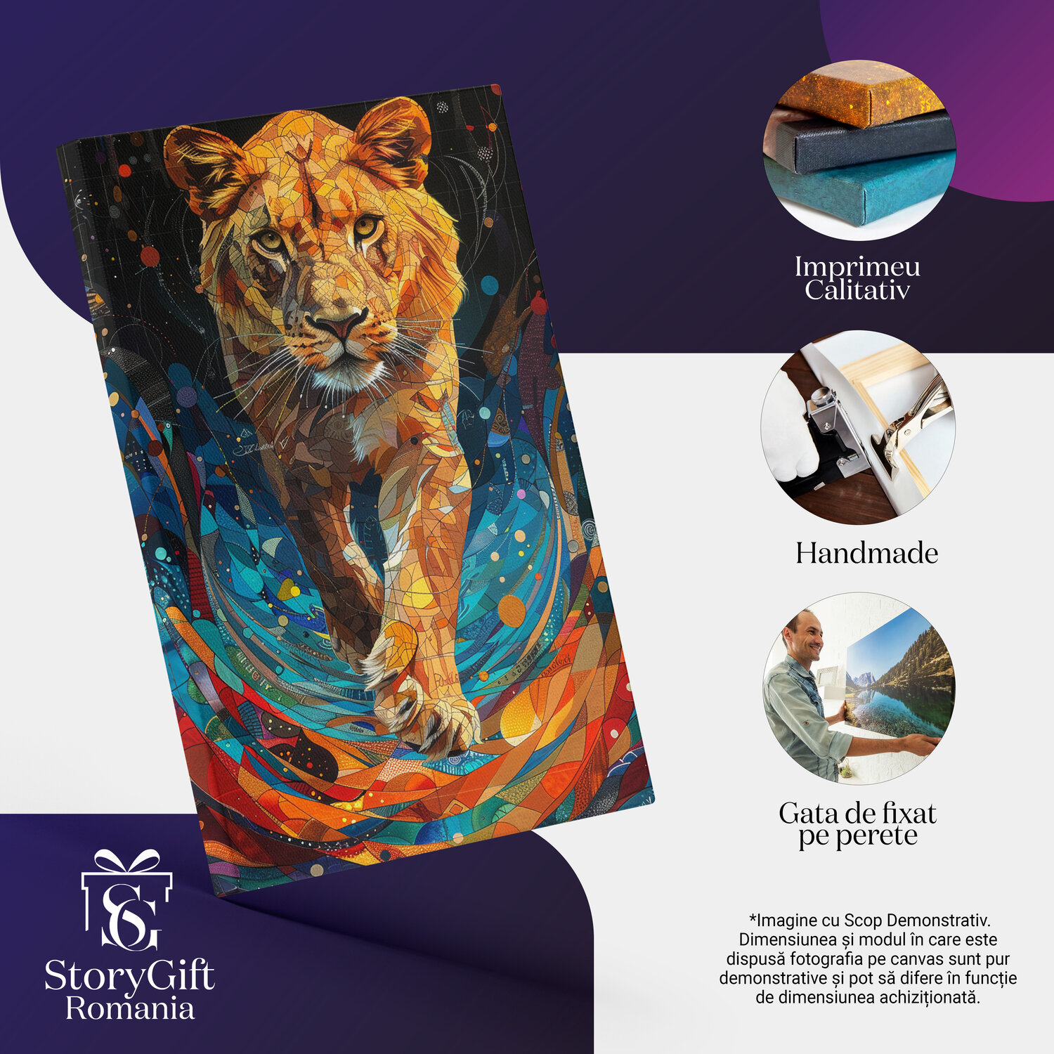 Tablou Canvas: Pictura in stil de vitraliu cu o leoaica - Pasi de felina in culorile curcubeului Pictura Digitala - Tablou Canvas Signature de la StoryGift Romania