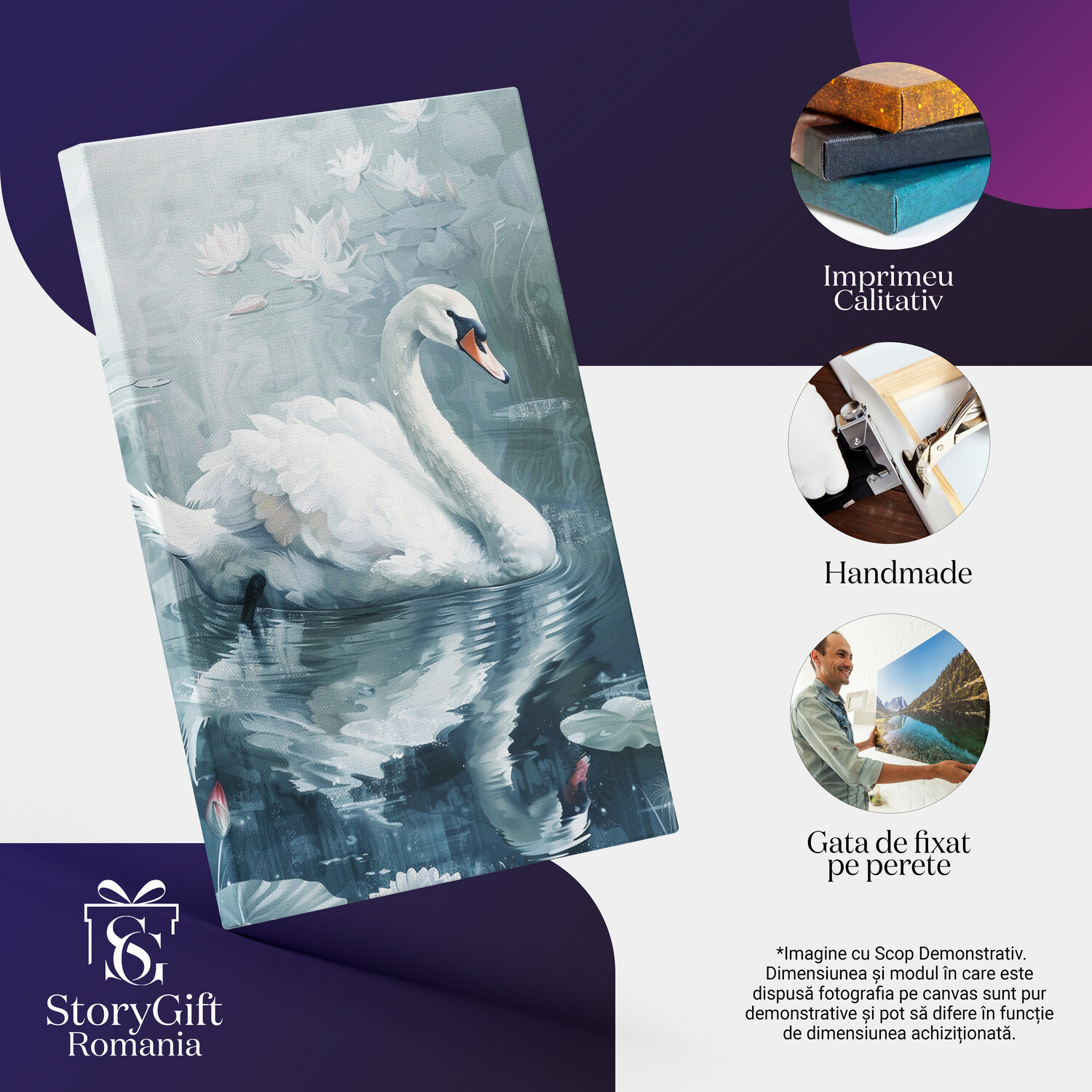 Tablou Canvas Pictura in ulei cu o lebada ce se reflecta pe lac- Nuferi pe apa, reflexia lebedei , Pictura Digitala - Tablou Canvas Signature de la StoryGift Romania