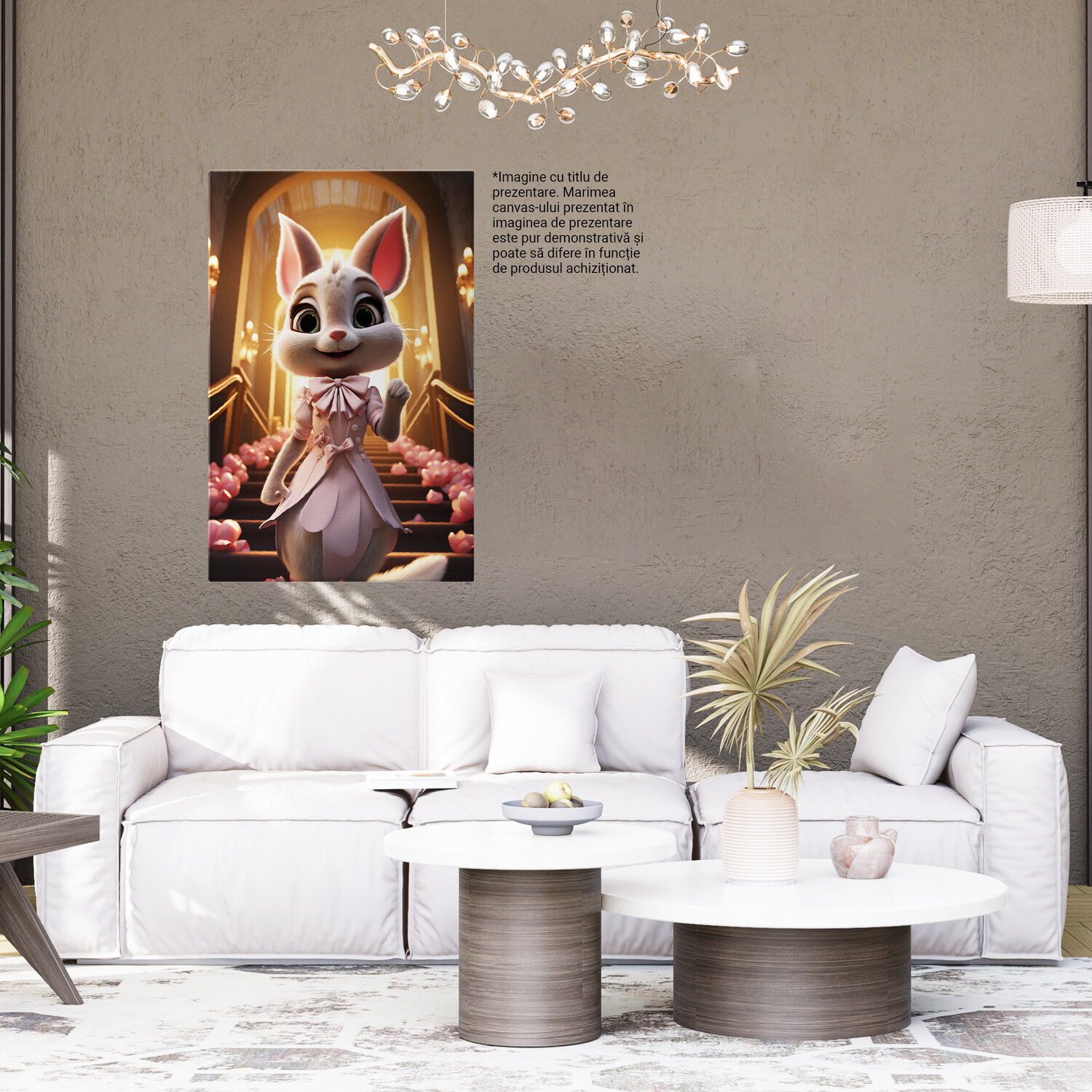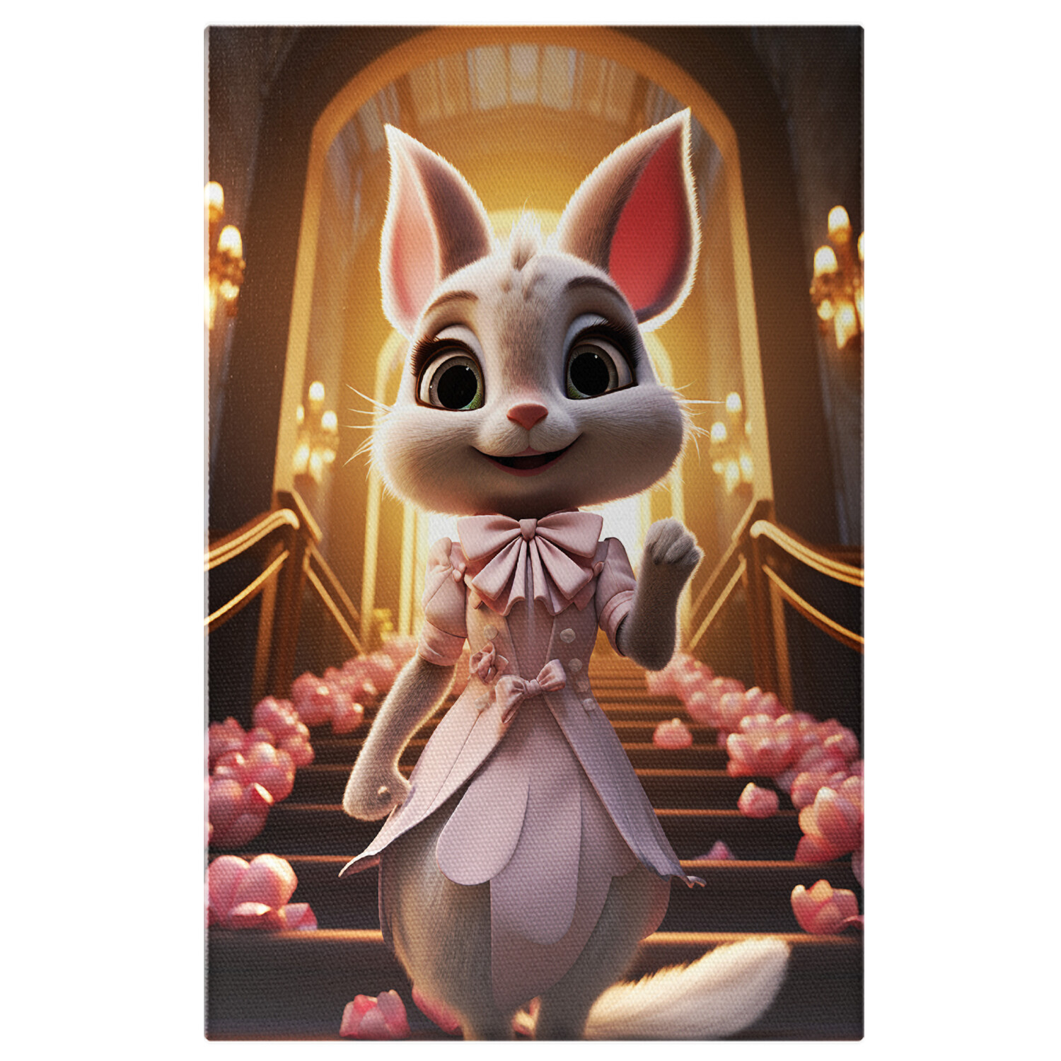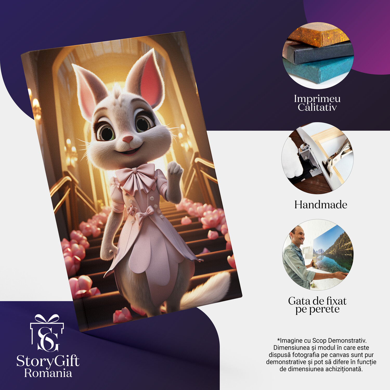 Tablou Canvas: Printesa Iepuras in Rochie de Printesa Roz coboara pe Scarile Decorate cu Flori Pictura Digitala - Tablou Canvas Signature de la StoryGift Romania