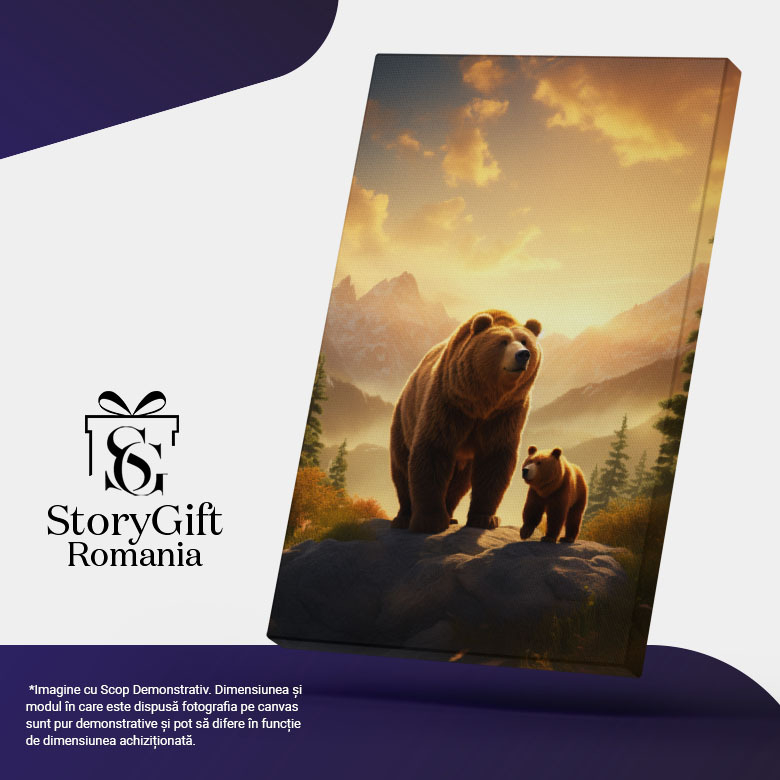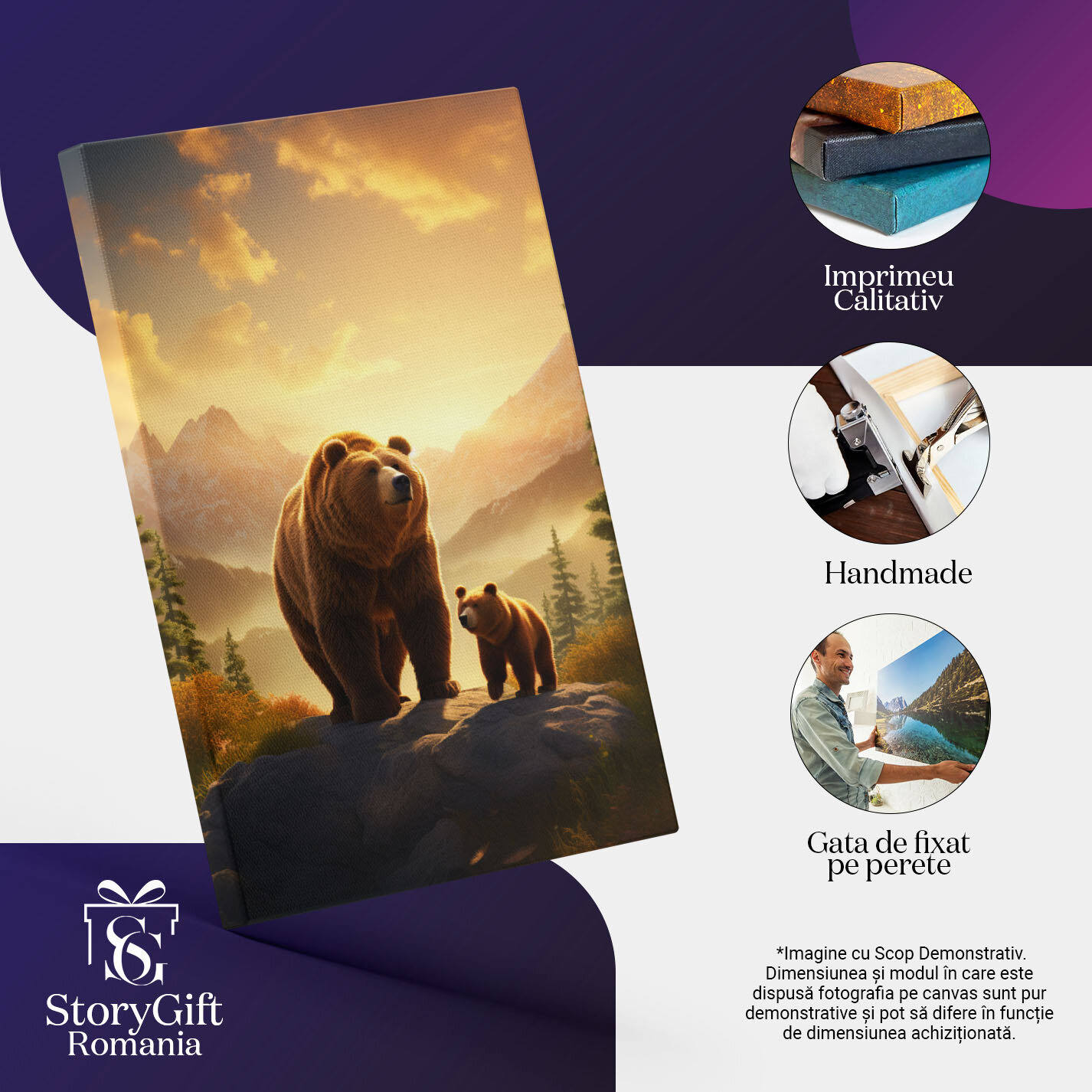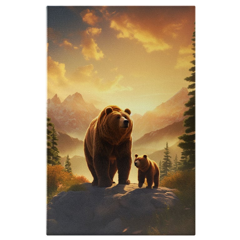 Tablou Canvas: Tatal Urs si Puiutul lui se Plimba prin Codrul Linistit Incercuiti de Brazi si Cer Luminos Pictura Digitala 40x25CM