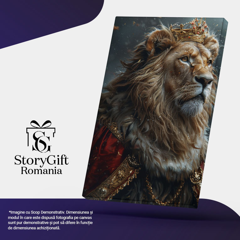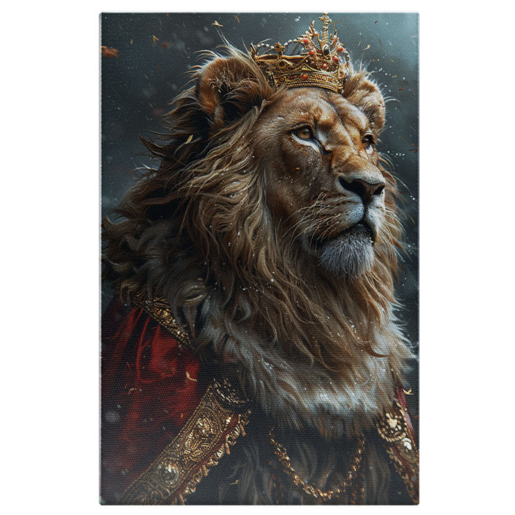 Tablou Canvas Regele Incoronat Leu cu Manta Rosie cu Margini Aurii si Coroana pe Cap cu o Coama Mare , Pictura Digitala 40x25CM