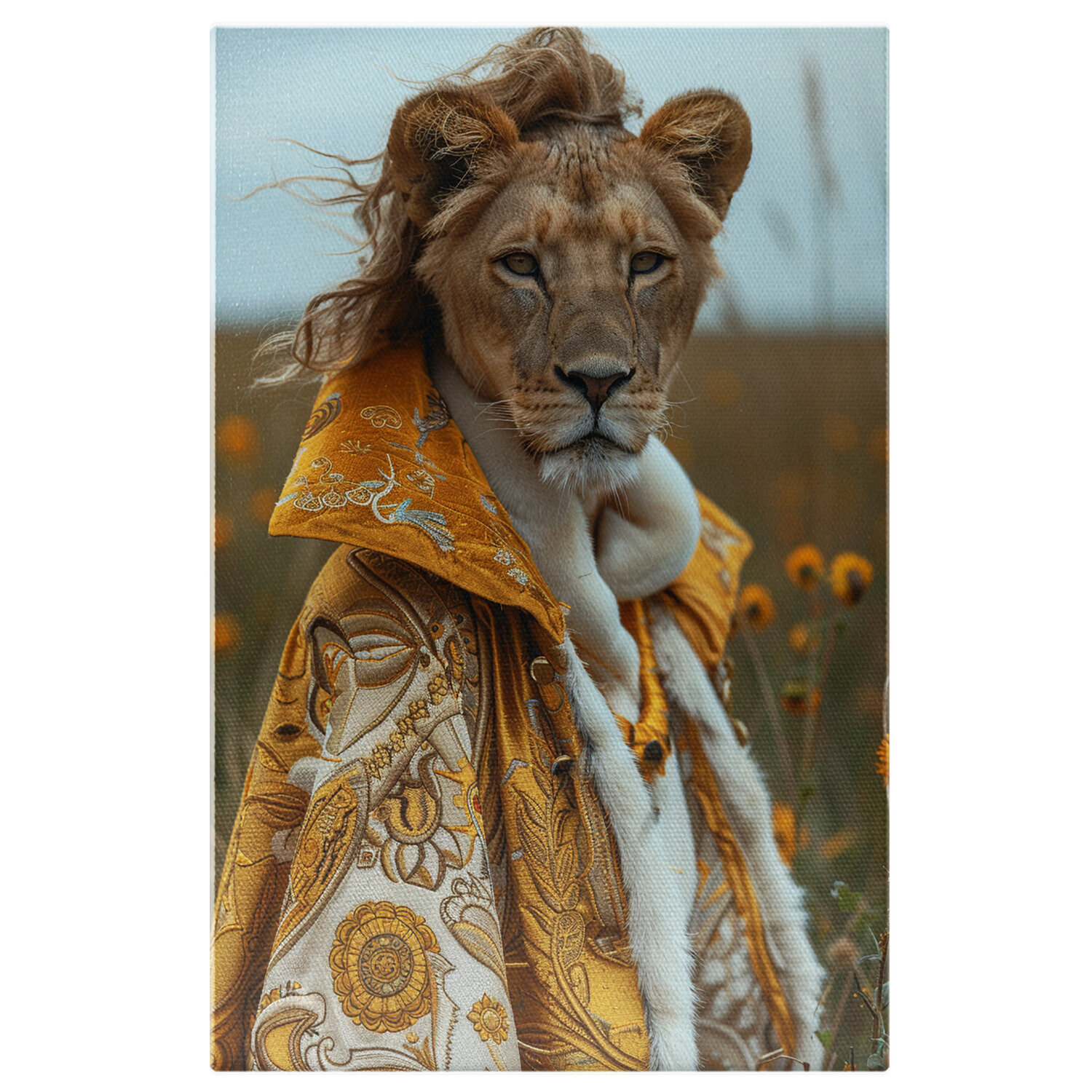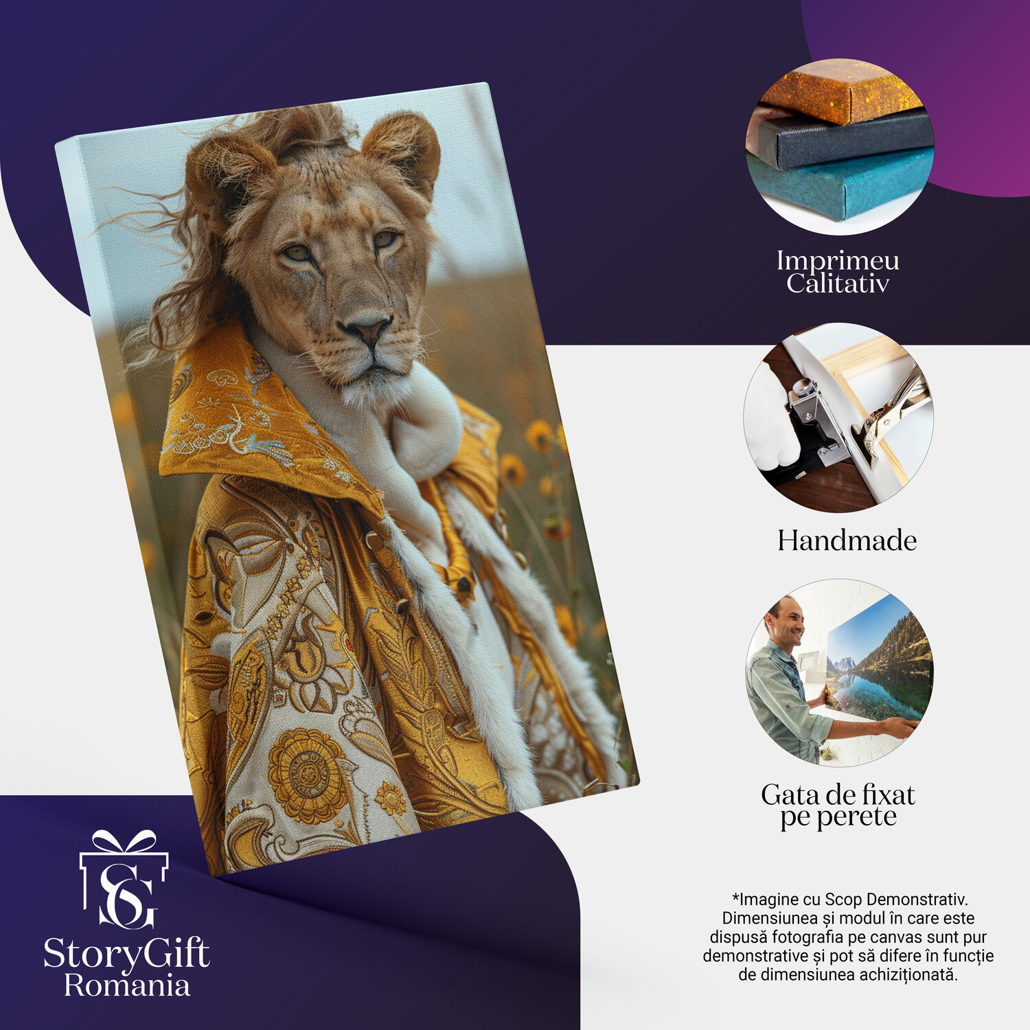 Tablou Canvas Regina Leoaica in Vesminte Regale Aurii si Coada Mareata Privire in Camp , Pictura Digitala - Tablou Canvas Signature de la StoryGift Romania