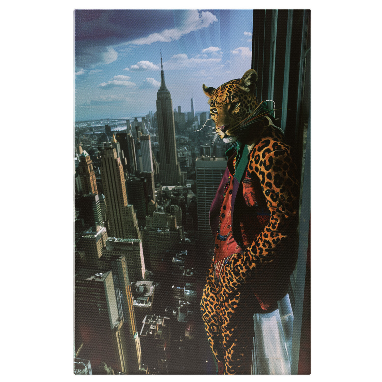 Tablou Canvas Seful Leopard cu Vesta si Sacou cu Mainile in Buzunar Priveste Deasupra Orasului Asezat pe Fereastra , Pictura Digitala - Tablou Canvas Signature de la StoryGift Romania