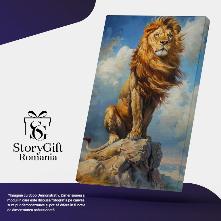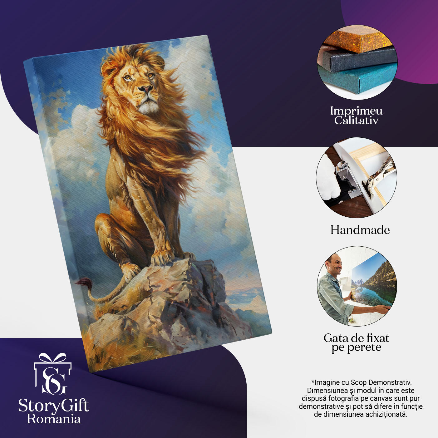 Tablou Canvas Cnavas Leul Regele Junglei cu Privirea Ganditoare si Ochii Galbeni sta Urcat pe o Stanca Mica , Pictura Digitala 40x25CM