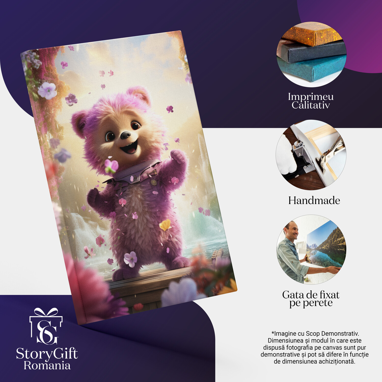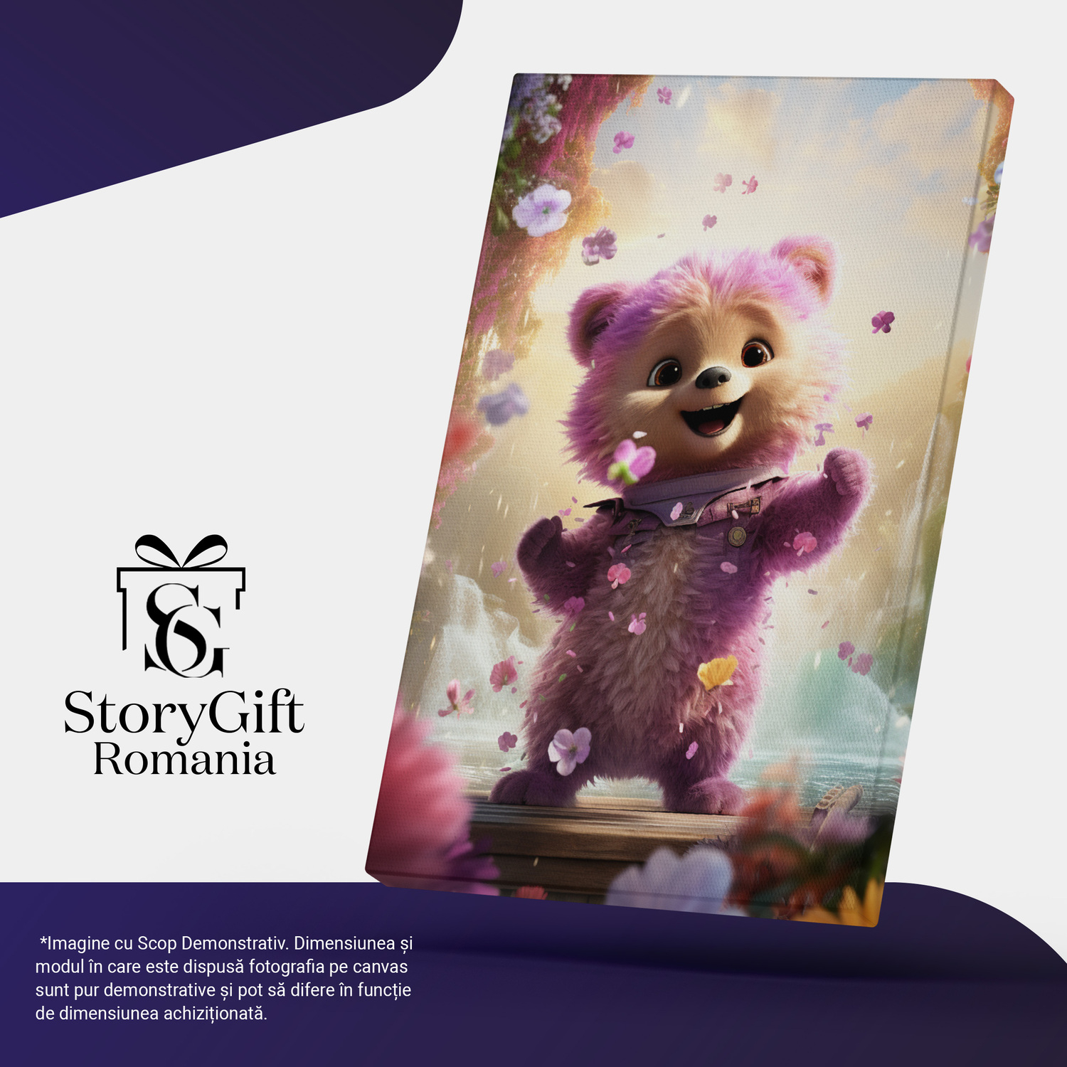 Tablou Canvas: Teddy Bear Cute Ursulet Mic si Mov-Roz Fericit Inconjurat de Floricele si Apa Dansand Pictura Digitala - Tablou Canvas Signature de la StoryGift Romania