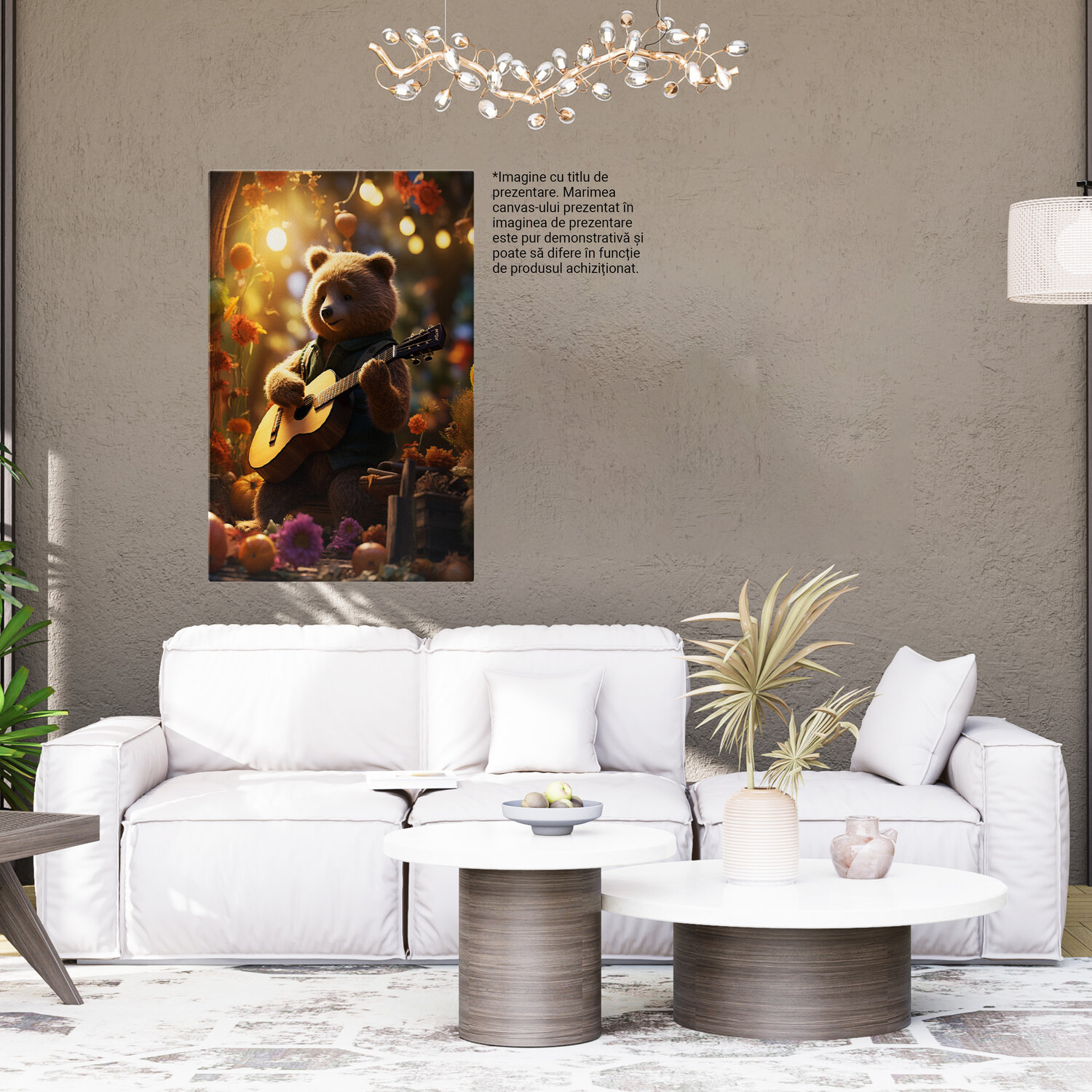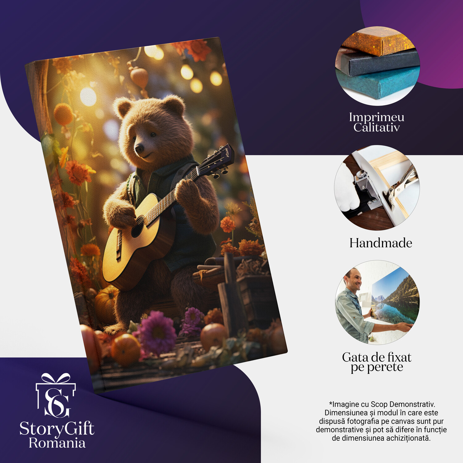 Tablou Canvas: Ursul care Exerseaza Cantand la Chitara cu Florile Imprejur si Vesta Verde, Urs Brun Pictura Digitala - Tablou Canvas Signature de la StoryGift Romania