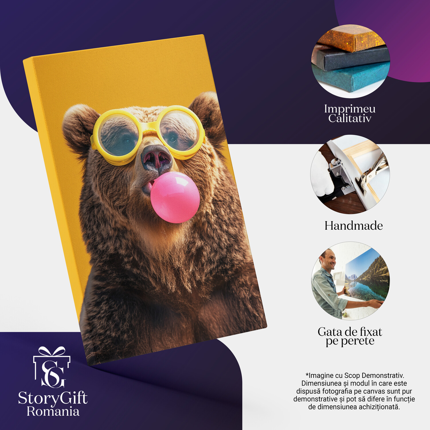 Tablou Canvas Ursul Grizzly Mesteca Guma Roz si Poarta Ochelari Galbeni de Vedere , Pictura Digitala - Tablou Canvas Signature de la StoryGift Romania