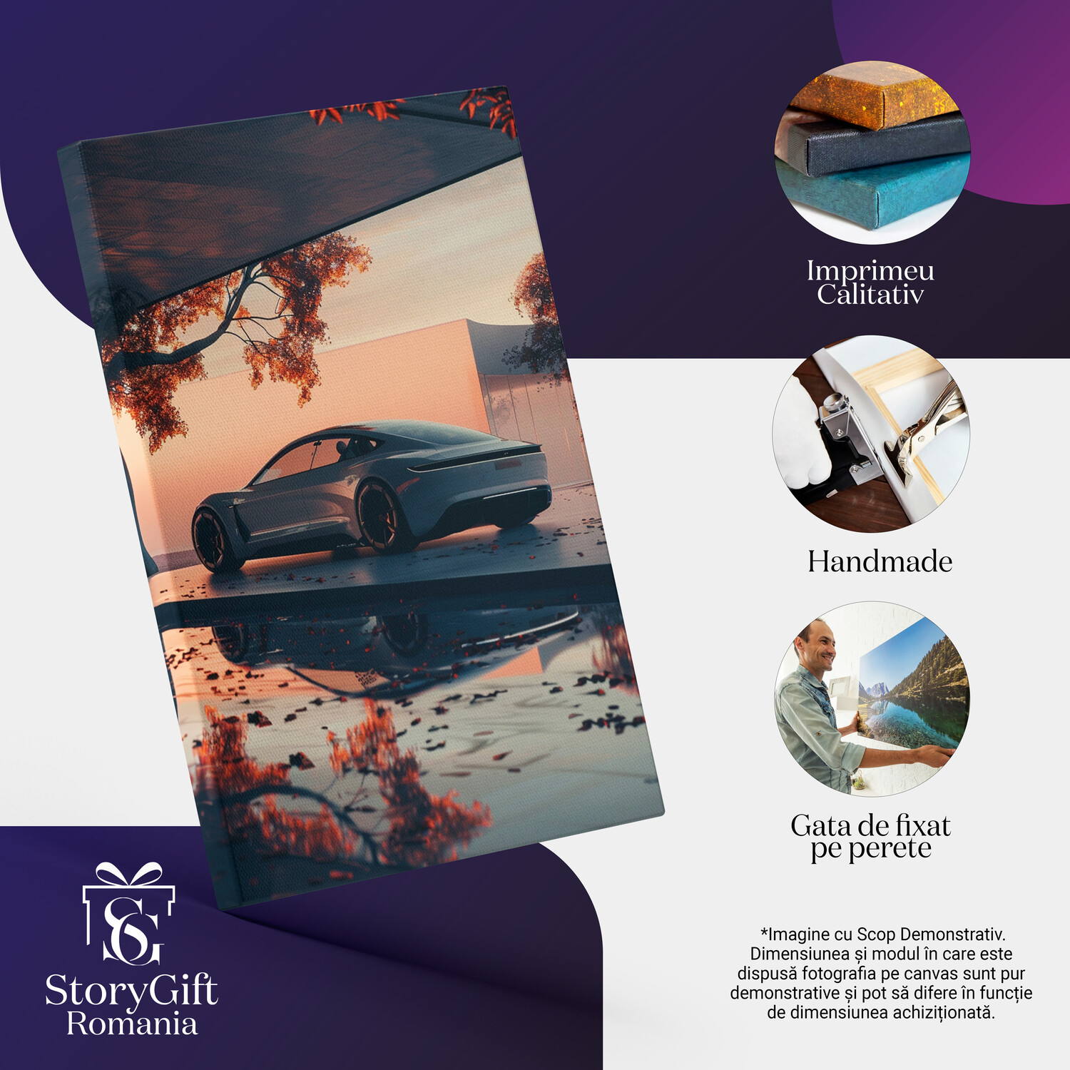 Tablou Canvas Masina Alba de Lux Parcata langa Piscina din Fata Casei cu Frunze Cazute si Copaci Imprejur , Pictura Digitala - Tablou Canvas Signature de la StoryGift Romania