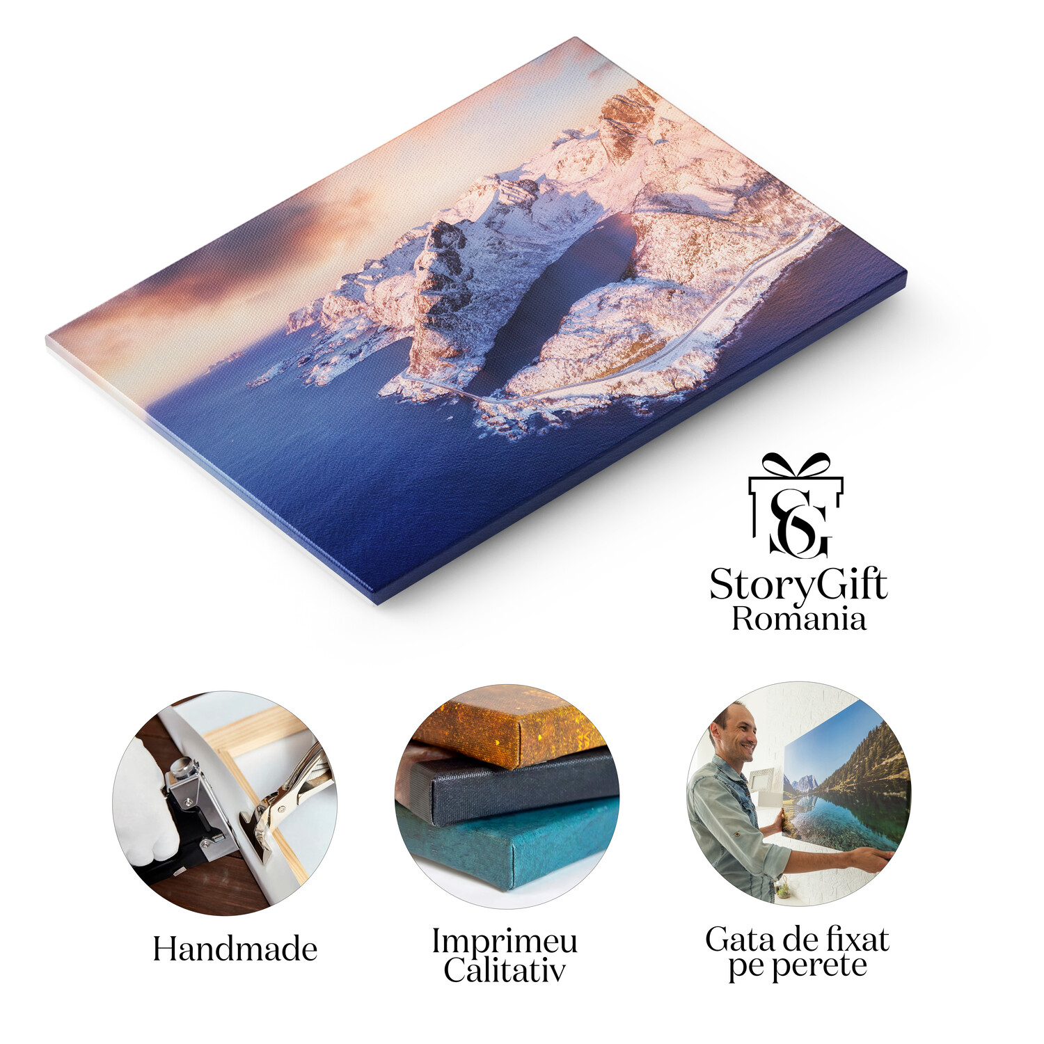 Tablou Canvas Reflexii si Apus in Muntii Lofoten, Norvegia aerian, reflectie, apus, munte, ocean - Tablou Canvas Signature de la StoryGift Romania