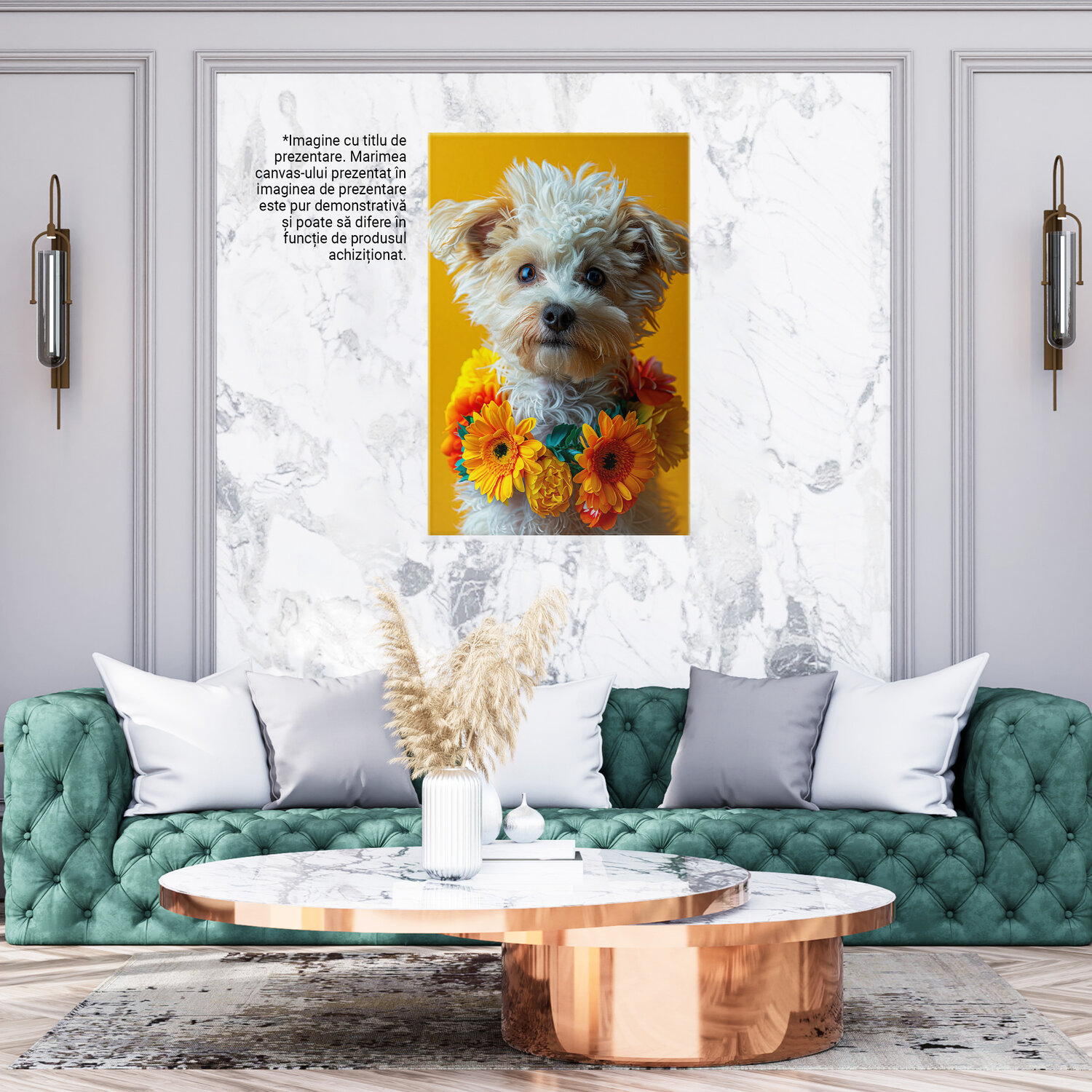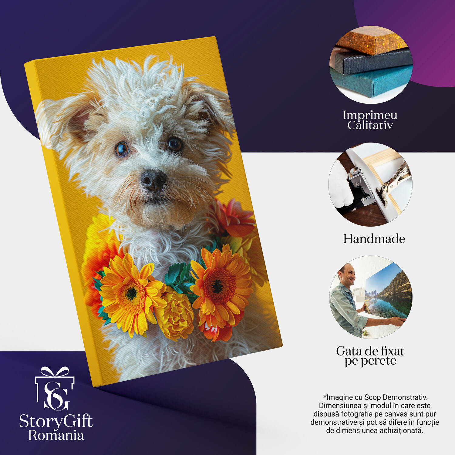 Tablou Canvas Catelul Alb Speriat cu Ghirlanda de Flori Galbene la Gat Pufosenia Prietenoasa , Pictura Digitala - Tablou Canvas Signature de la StoryGift Romania