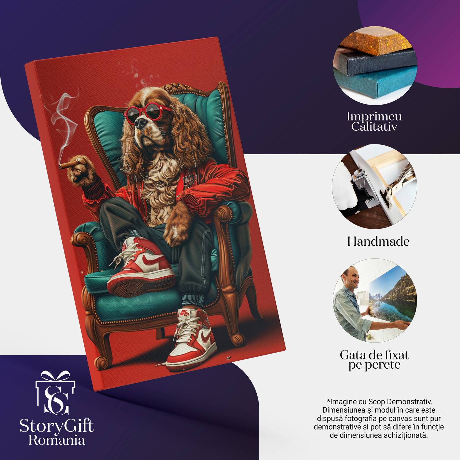 Tablou Canvas Cocker Modern in Fotoliu Fumeaza si Este Incaltat cu Bascheti Nike , Pictura Digitala - Tablou Canvas Signature de la StoryGift Romania