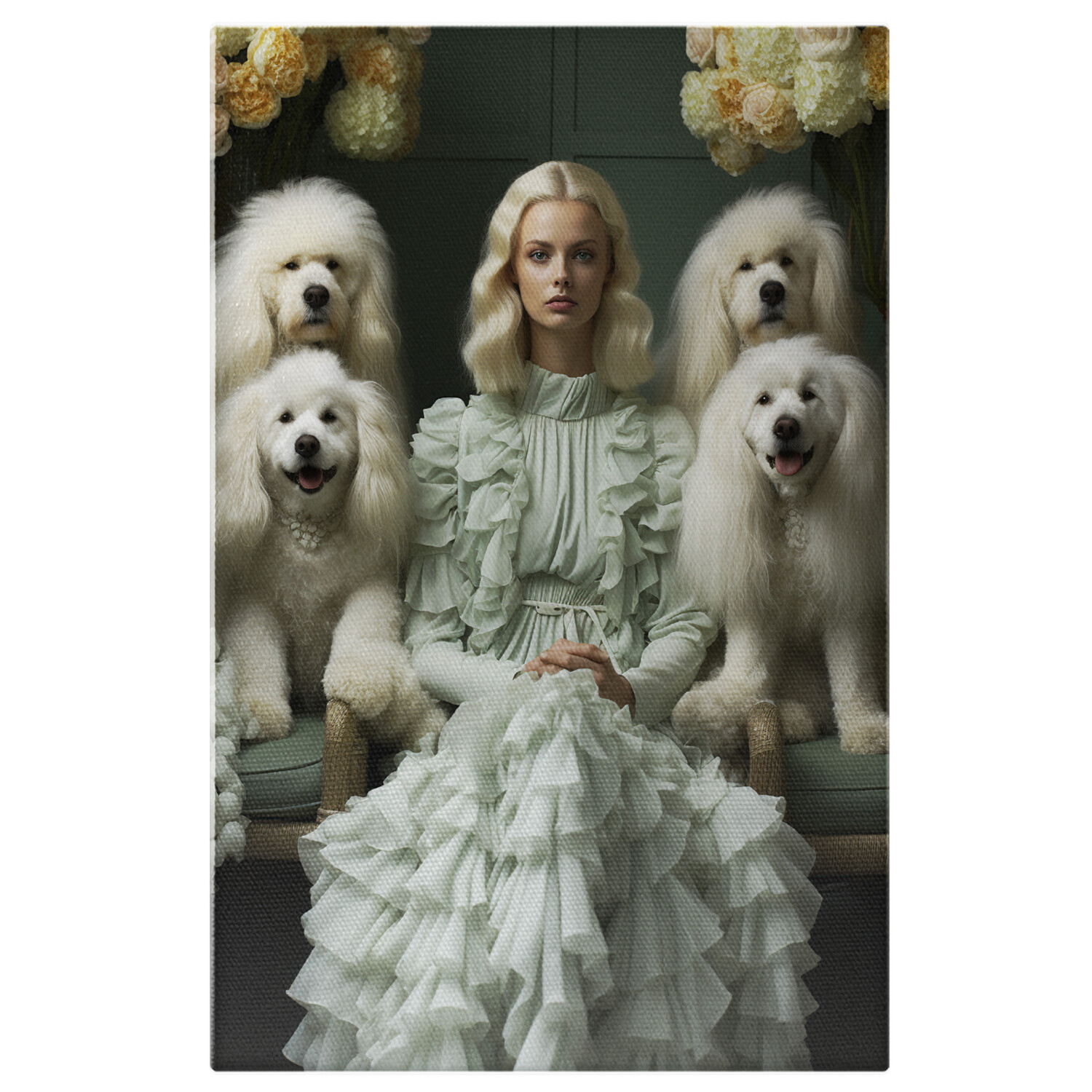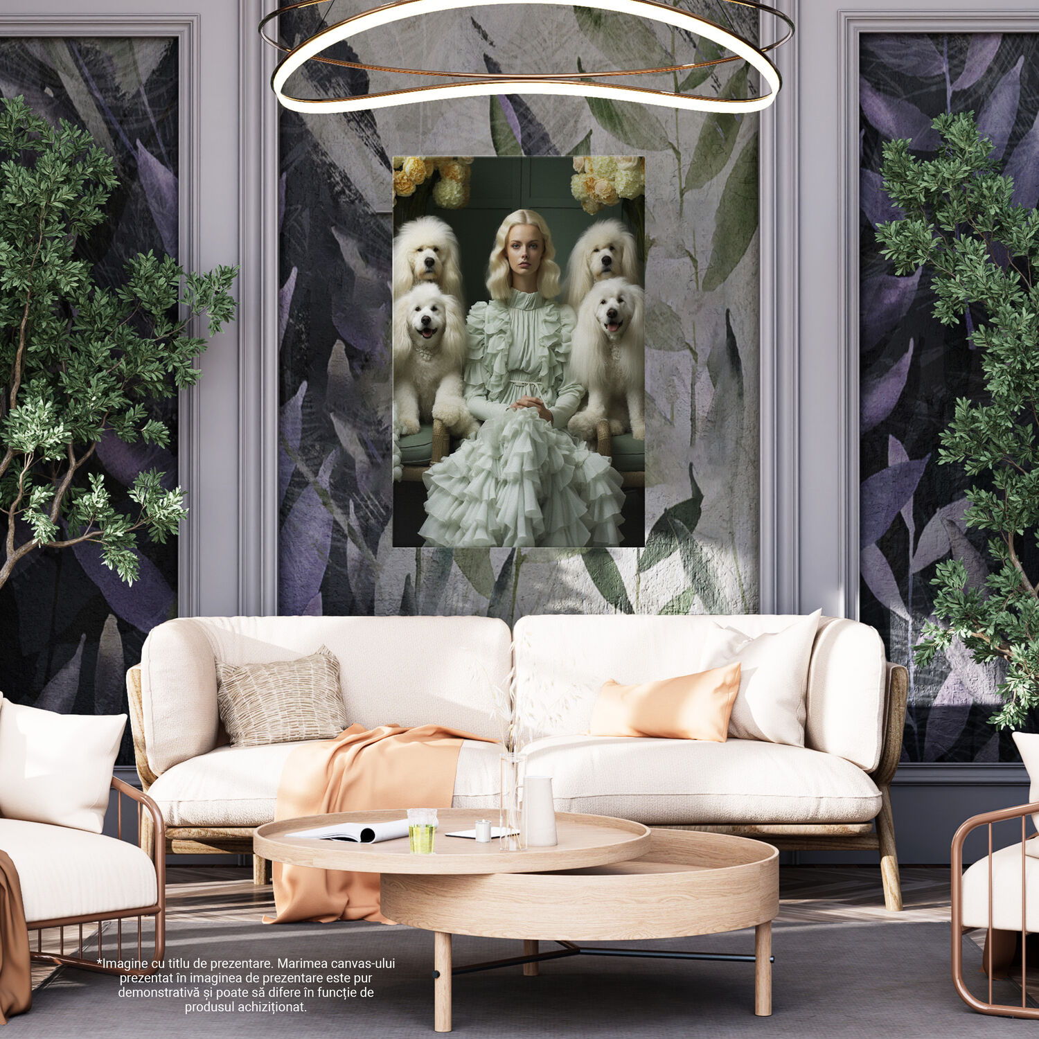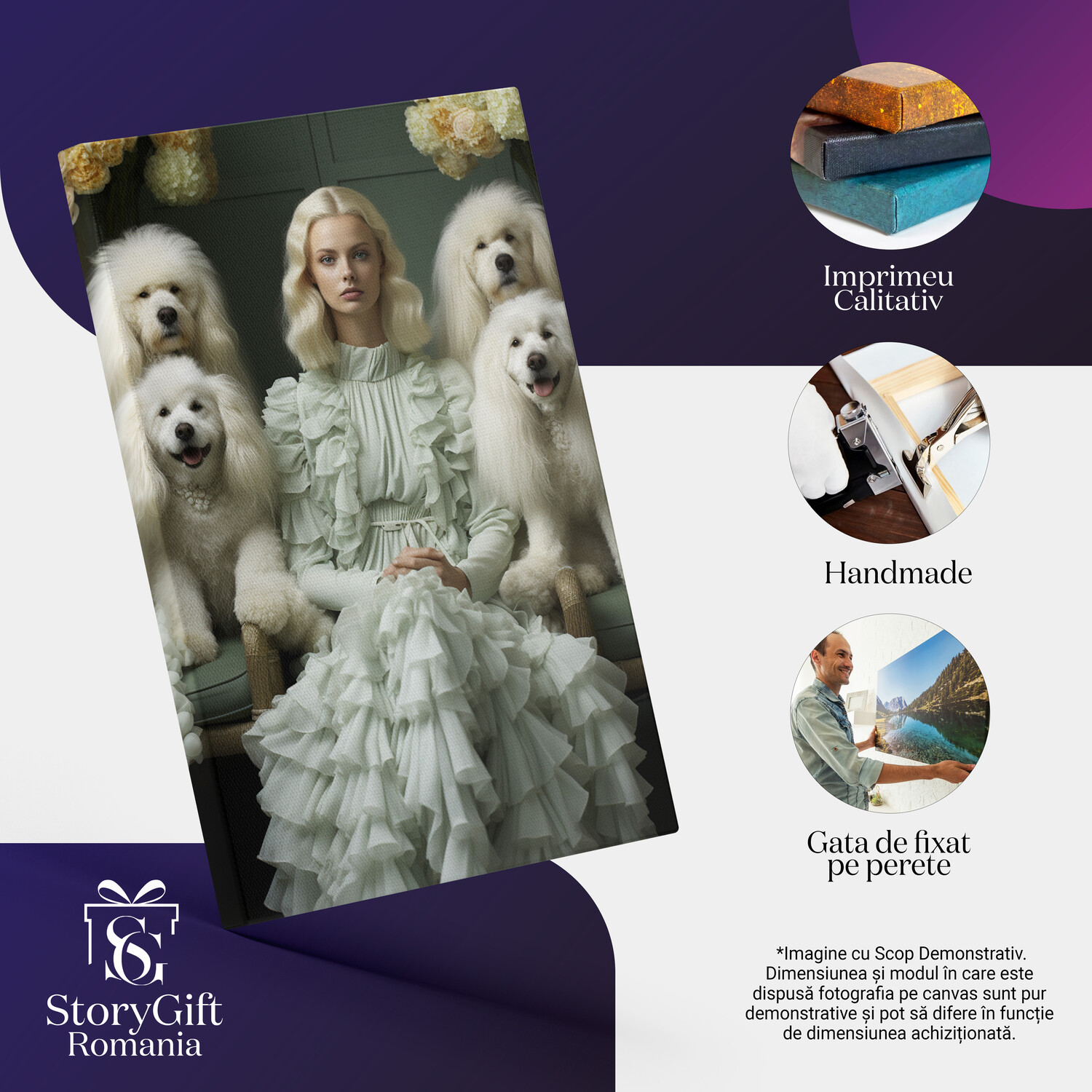 Tablou Canvas: Fotografie cu o femeie blonda frumoasa stand langa patru caini - albi rochie Pictura Digitala - Tablou Canvas Signature de la StoryGift Romania