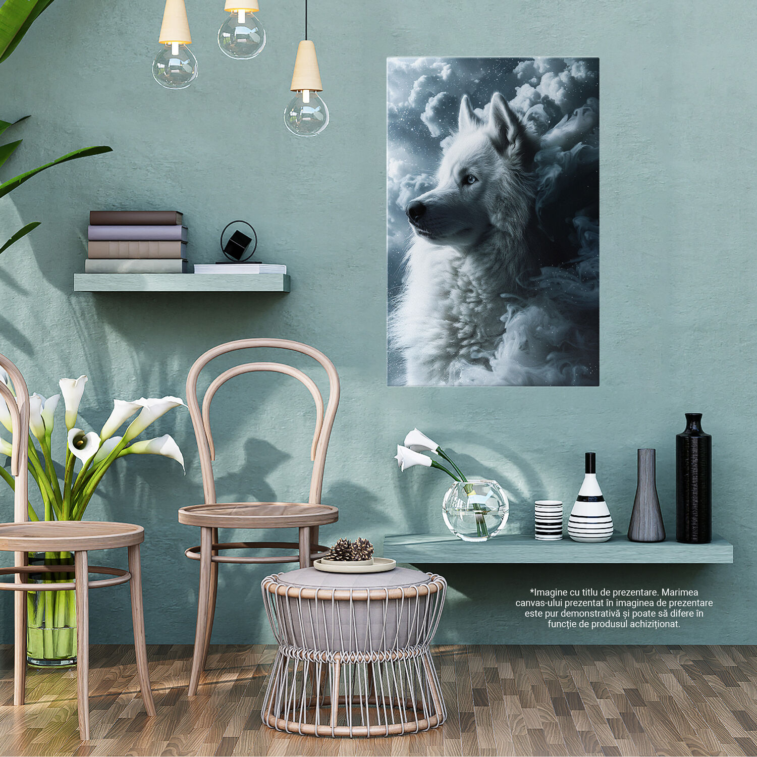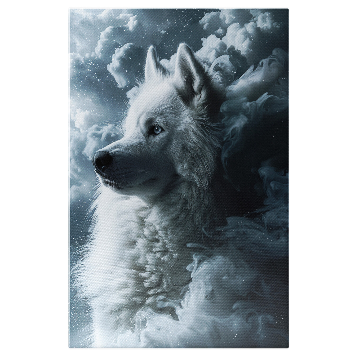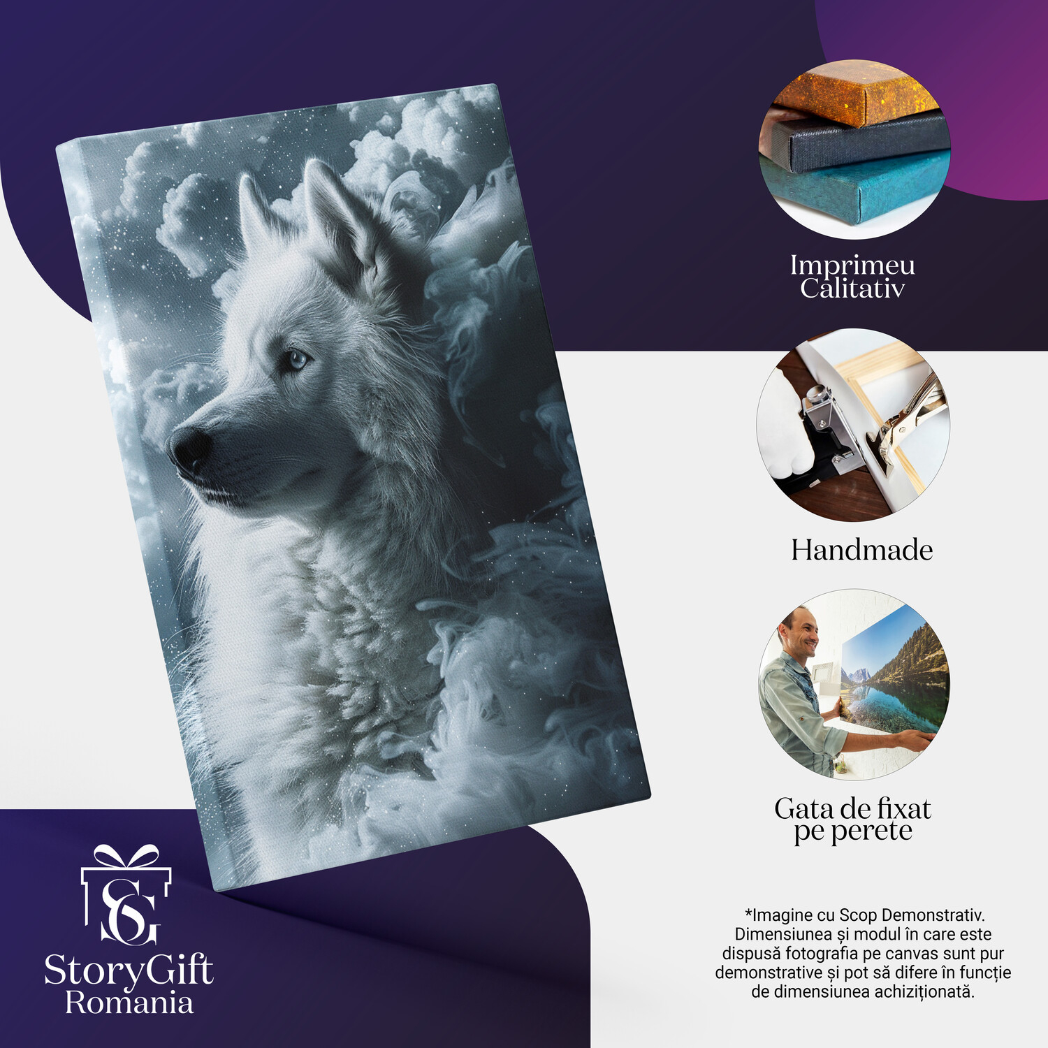 Tablou Canvas: Husky alb cu ochii albastri ce rasare dintre nori - Suprematia rasei Husky Pictura Digitala - Tablou Canvas Signature de la StoryGift Romania