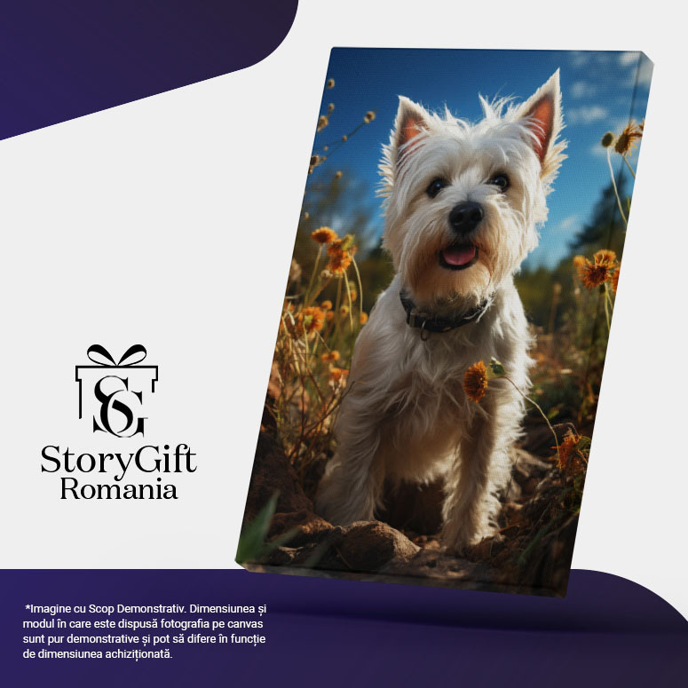 Tablou Canvas: Câmpul cu Flori și Câinele Patrocle fără Lesă Animal Liber în Păpădii Pictura Digitala 40x25CM