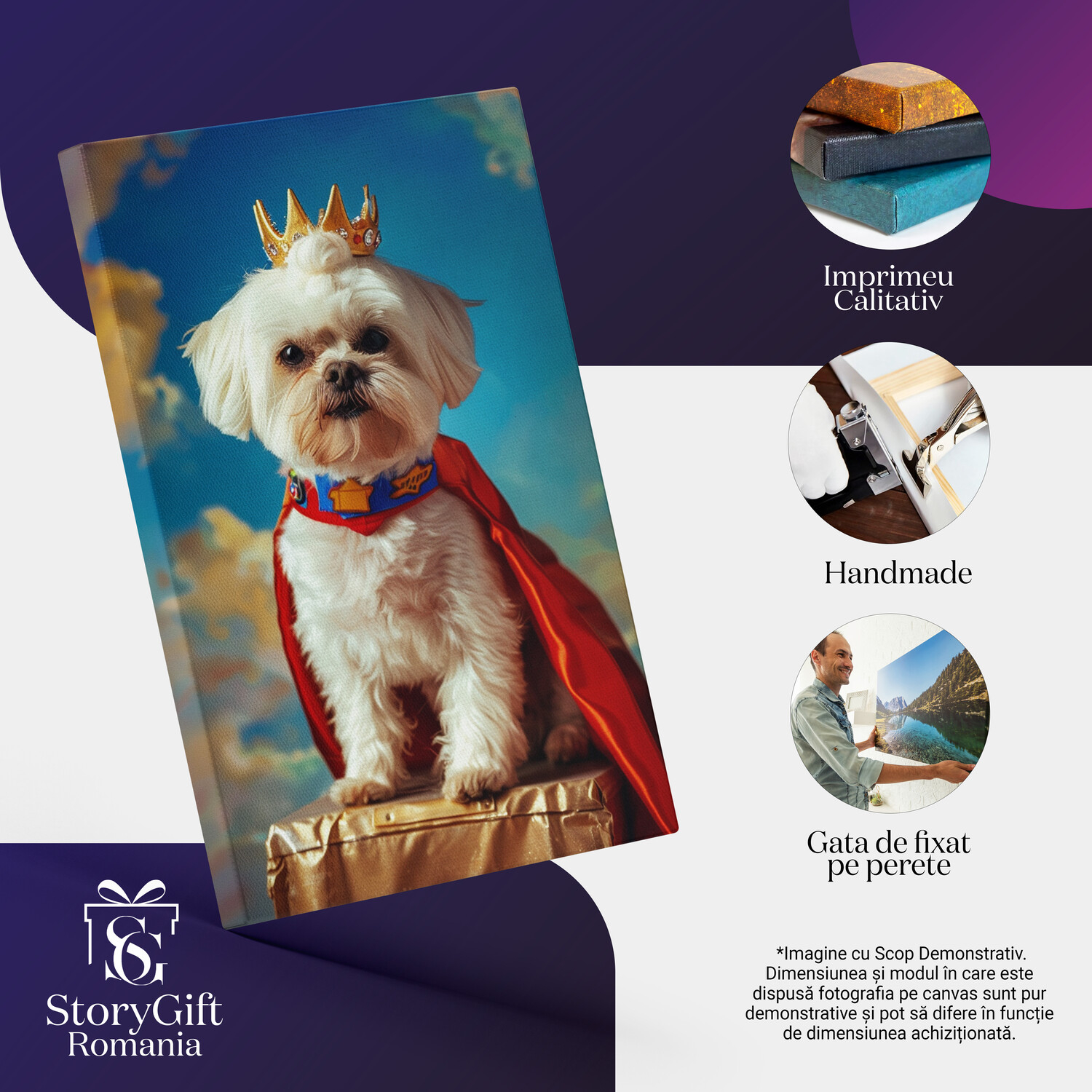 Tablou Canvas Supereroul Rege Catelusul Maltis pe Podium In Ziua Senina cu Cer Albastru , Pictura Digitala - Tablou Canvas Signature de la StoryGift Romania