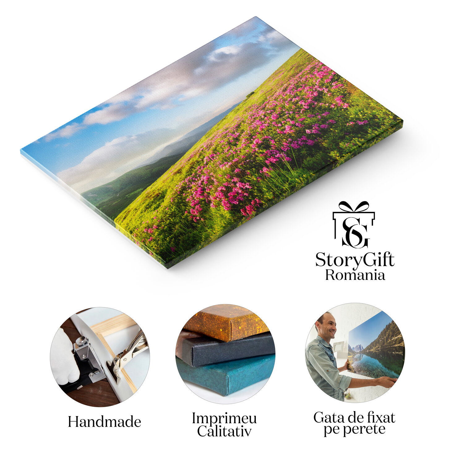 Tablou Canvas Camp de Flori la Apus in Munti, peisaj, munte, calatorie, apus, flori - Tablou Canvas Signature de la StoryGift Romania