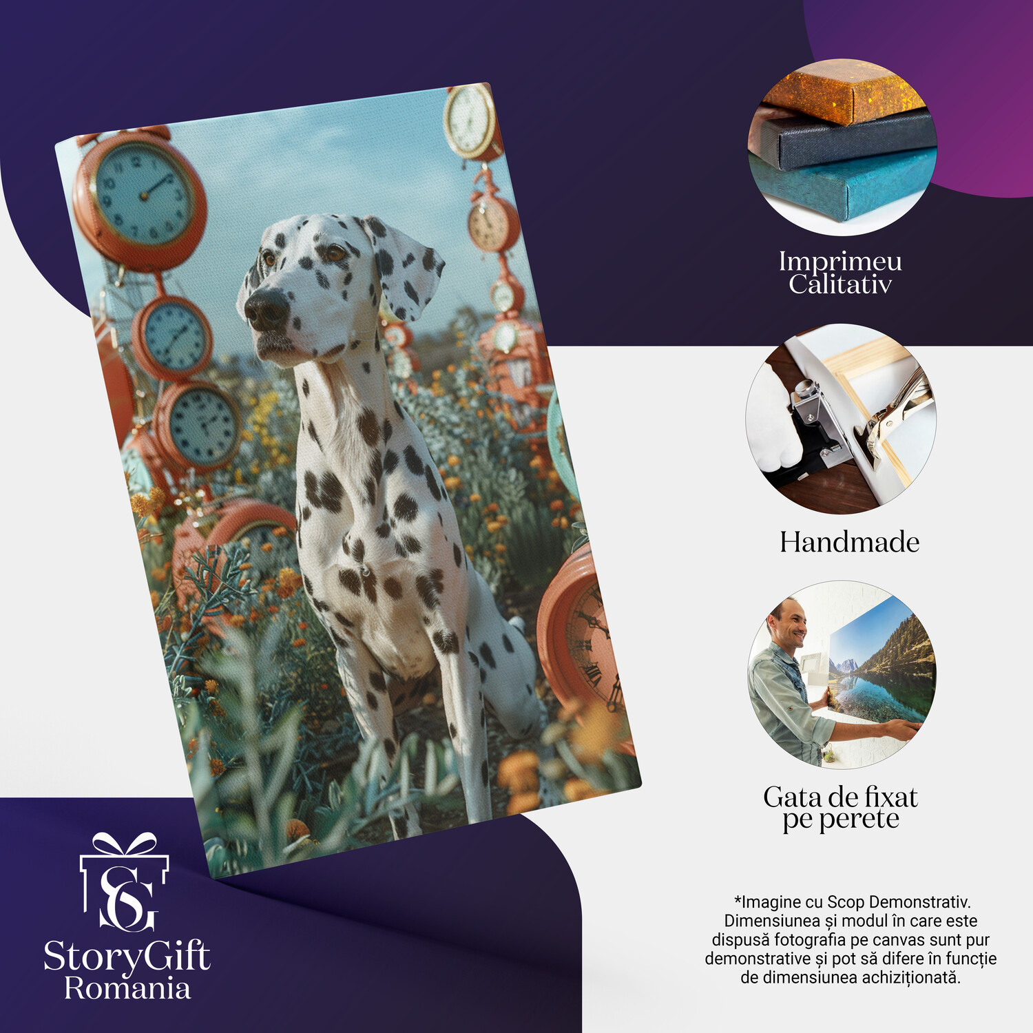 Tablou Canvas Dalmatianul Nerabdator in Multimea de Flori Galbene si Ceasuri Nenumarate , Pictura Digitala - Tablou Canvas Signature de la StoryGift Romania