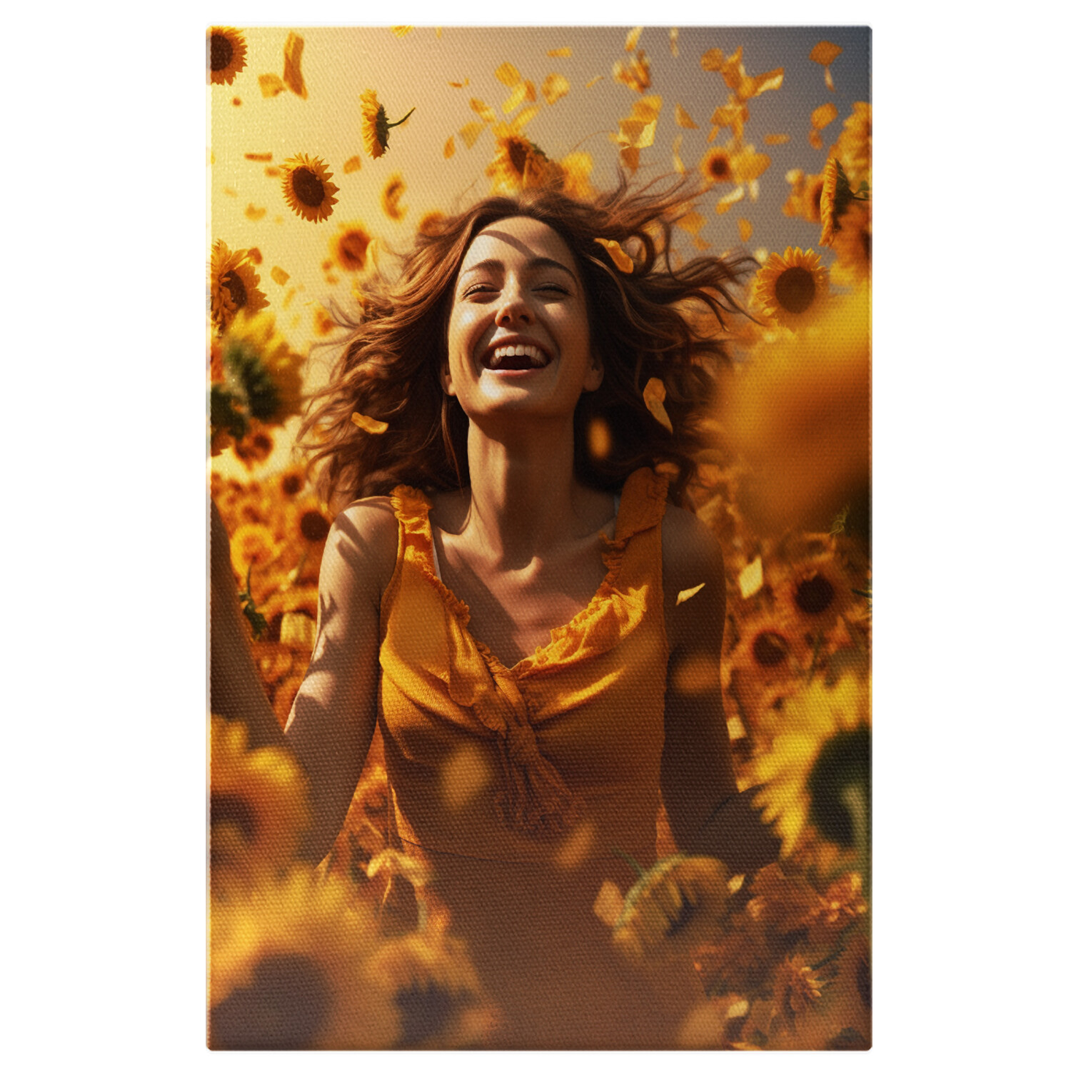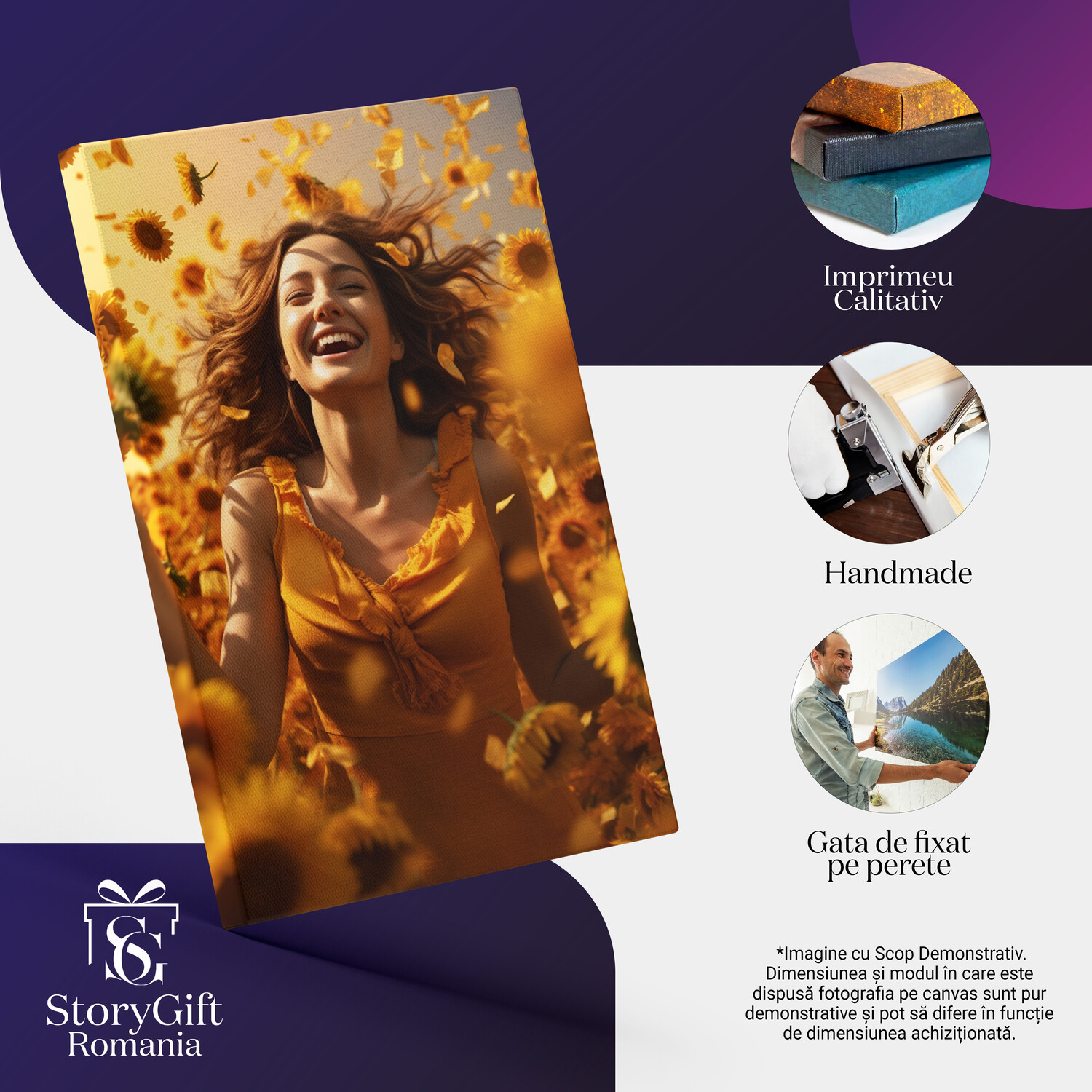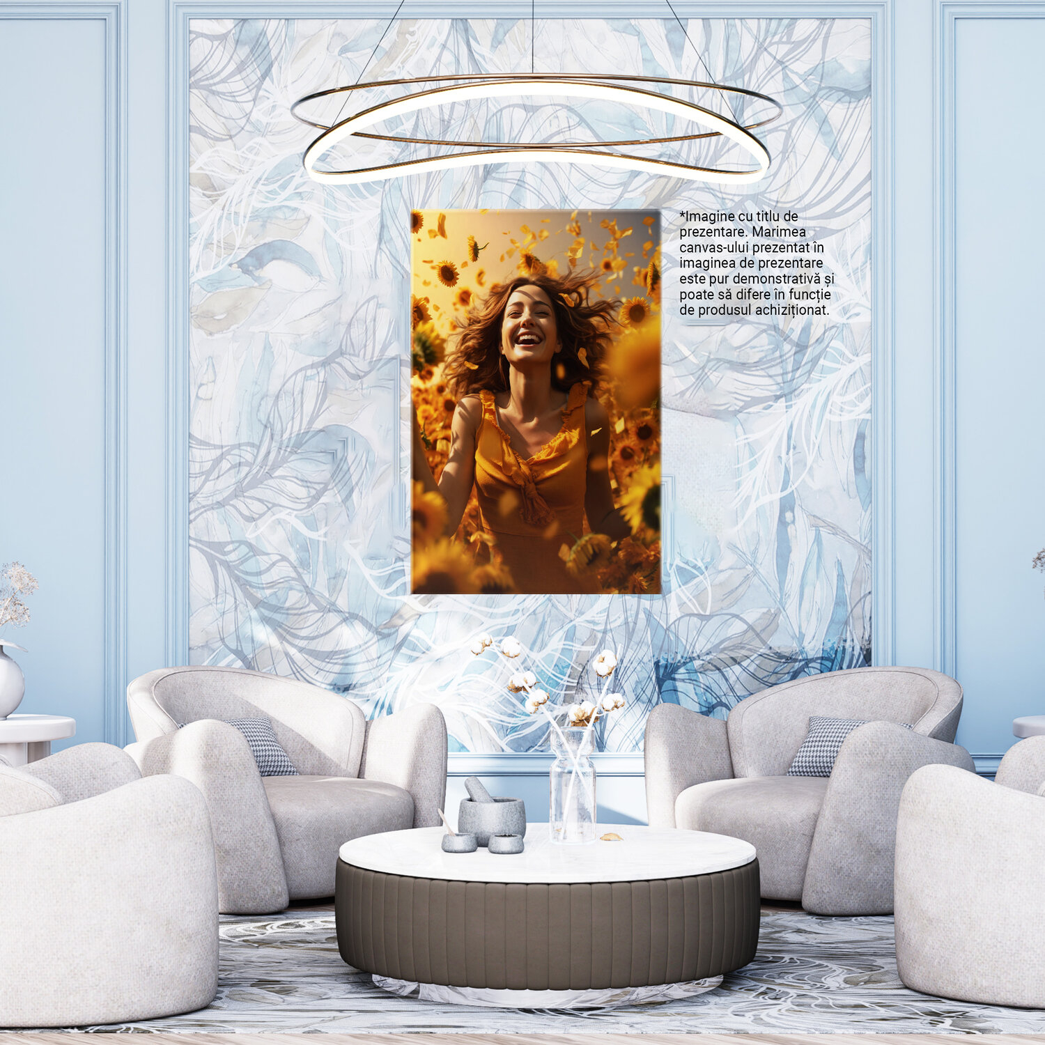 Tablou Canvas: Dinamic Femeie care Zambeste in Armonia Naturii in Miscare - Cadru Natural si Frumusetea Florilor Pictura Digitala - Tablou Canvas Signature de la StoryGift Romania