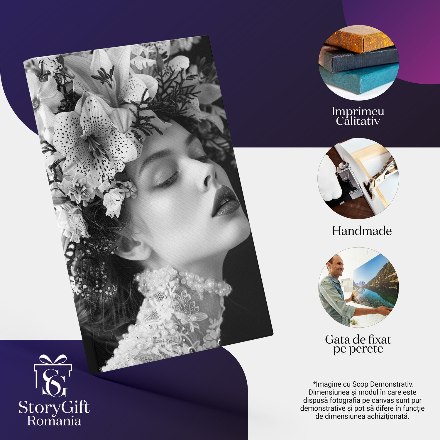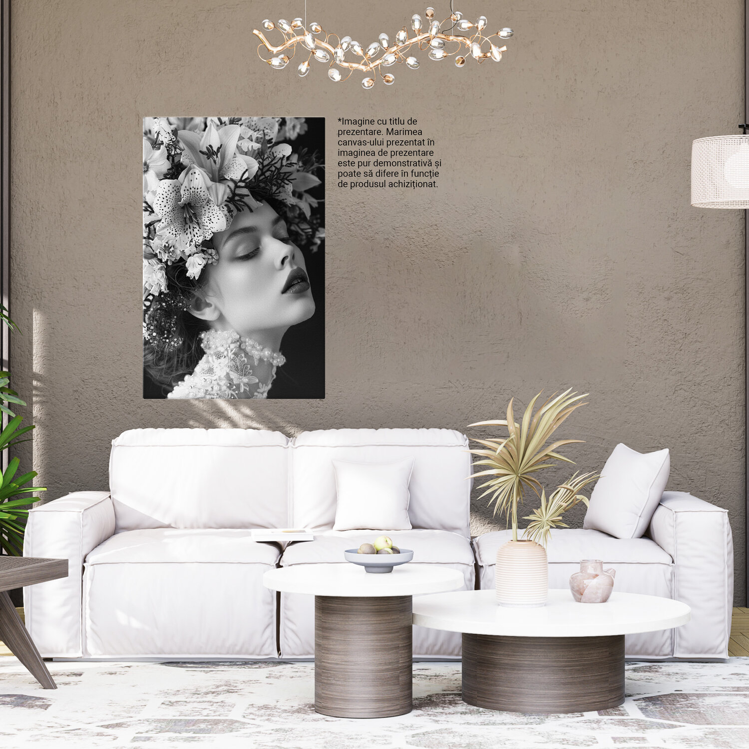 Tablou Canvas: Portret Alb-Negru cu o Femeie cu Flori in Par cu Buze Mari si Rochie Dantelata Pictura Digitala - Tablou Canvas Signature de la StoryGift Romania