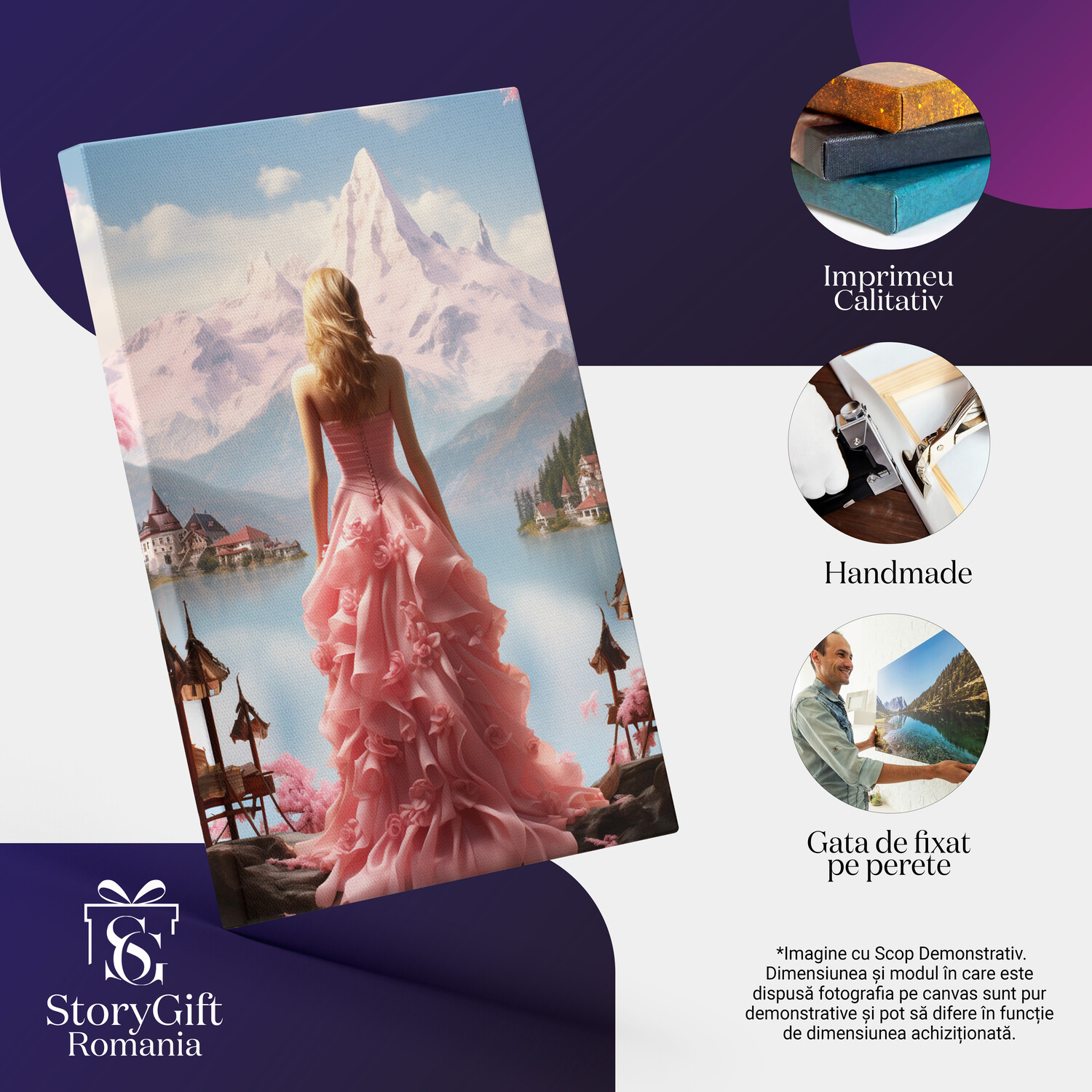 Tablou Canvas: Arta Feminina Rochie cu Trena de Trandafiri in Peisaj de Case Si Munti Pictura Digitala - Tablou Canvas Signature de la StoryGift Romania
