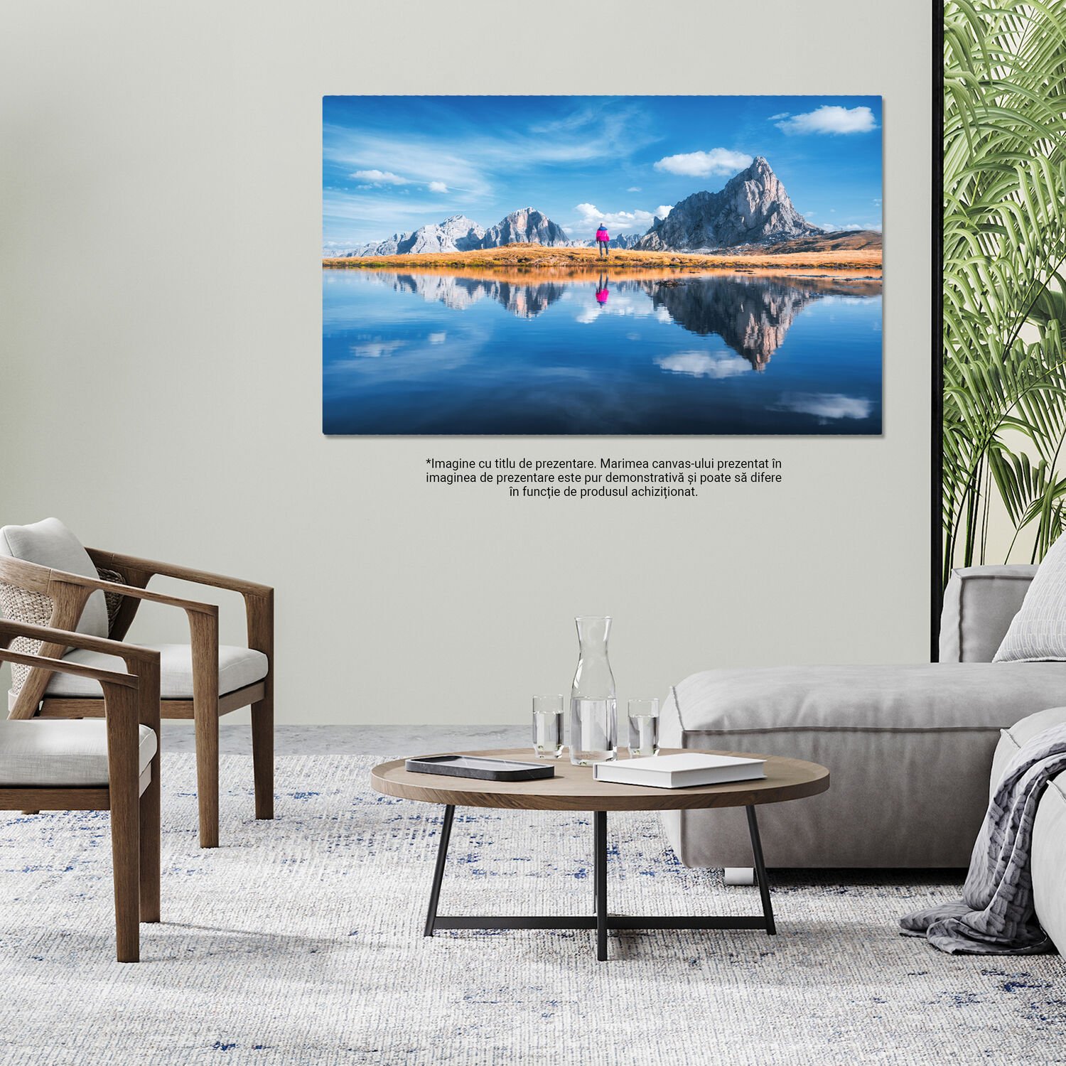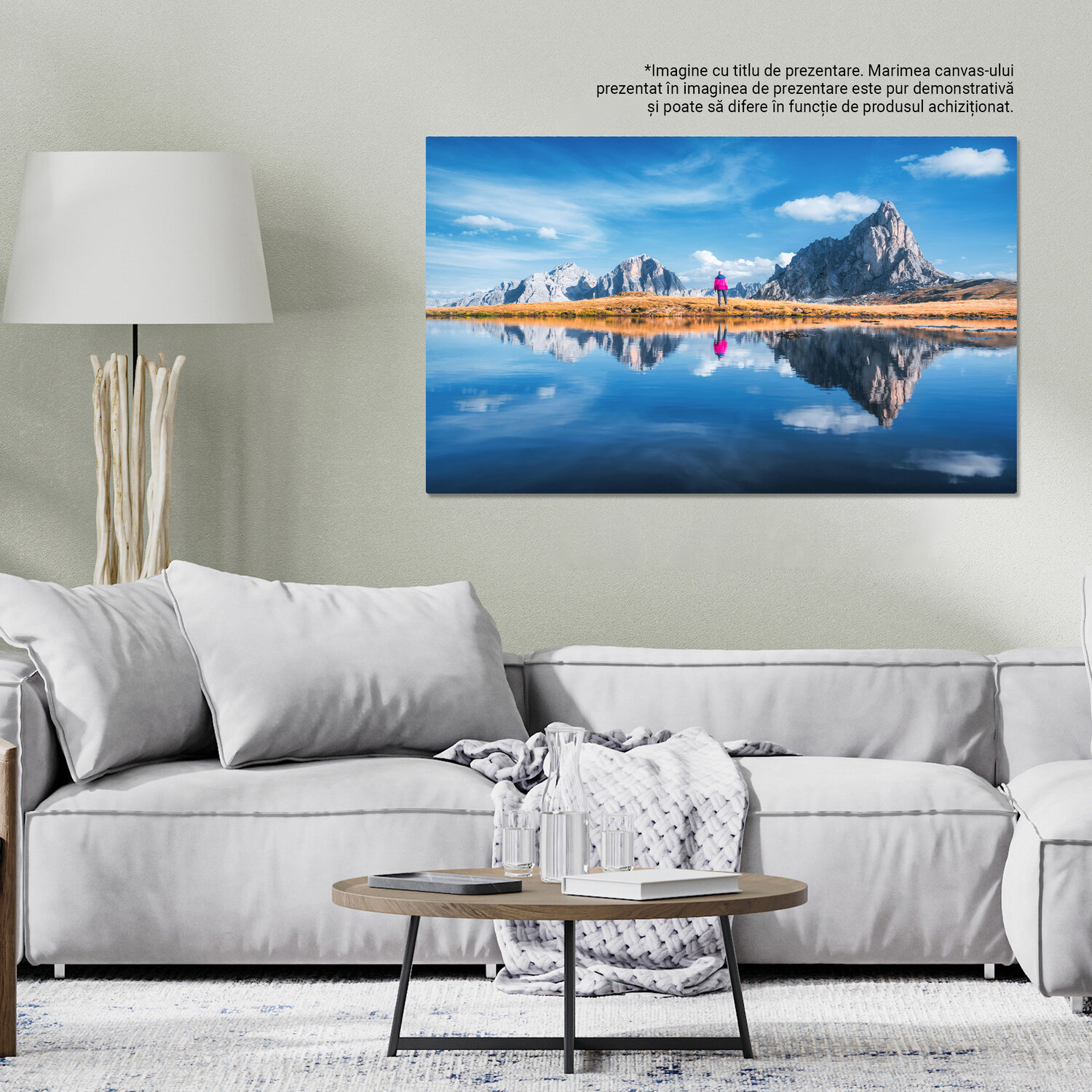 Tablou Canvas - Peisaj Montan: Femeie Reflectata in Apa Limpeda a Lacului de Munte intr-o Zi Frumoasa - Tablou Canvas Signature de la StoryGift Romania