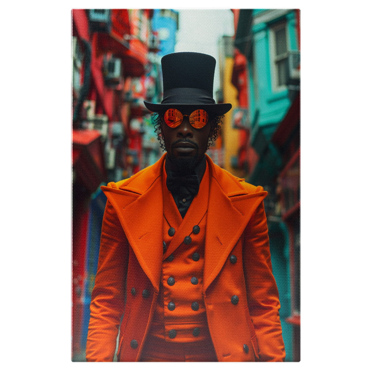 Tablou Canvas Barbat African cu Ochelari si Joben Negru in Costum Portocaliu Fosforescent cu Nasturi Negrii , Pictura Digitala - Tablou Canvas Signature de la StoryGift Romania