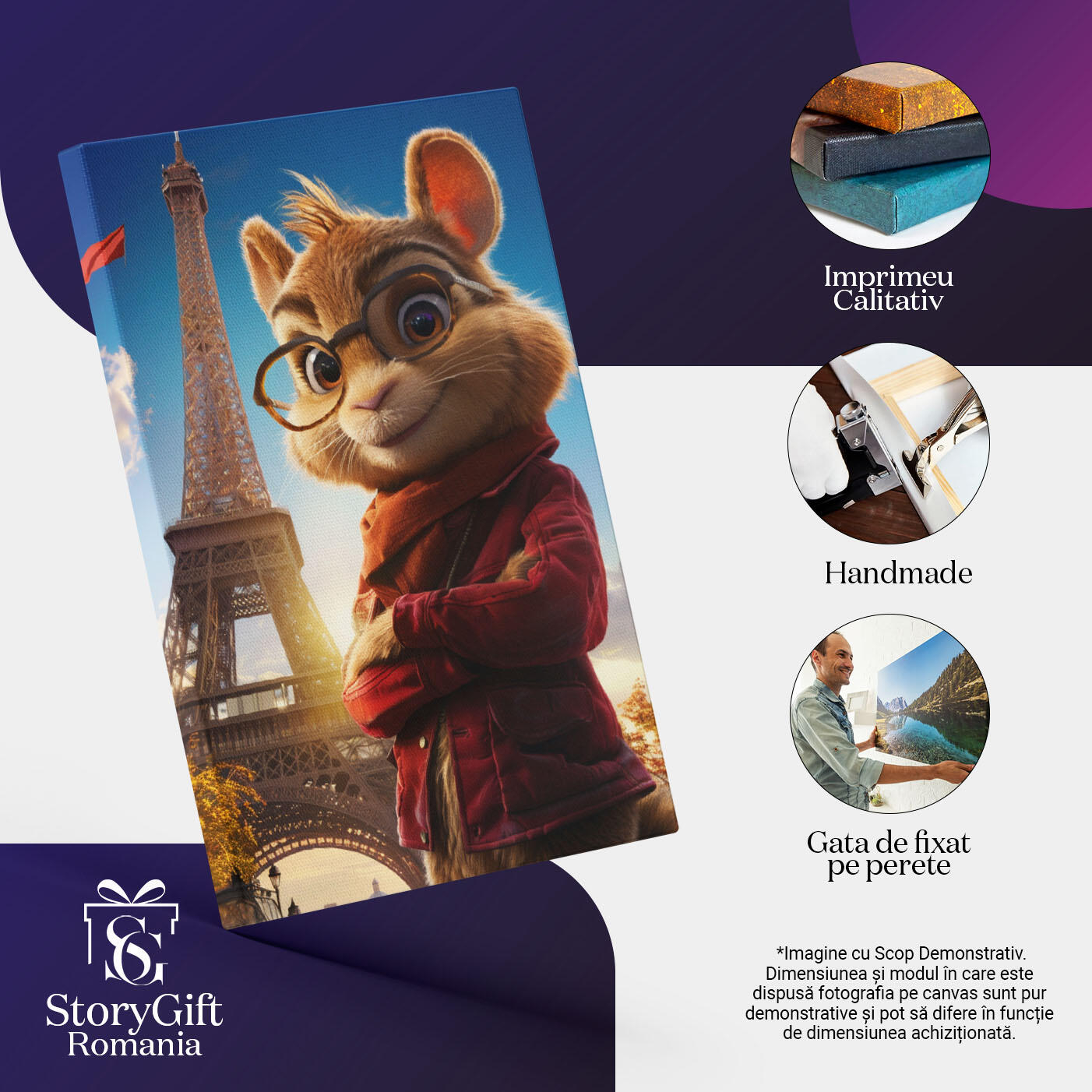 Tablou Canvas: Imaginea unui Veverite cu Jacheta Rosie , Ochelari si Turnu Eifel - Fotografie Artistica si Animatie Pictura Digitala 40x25CM