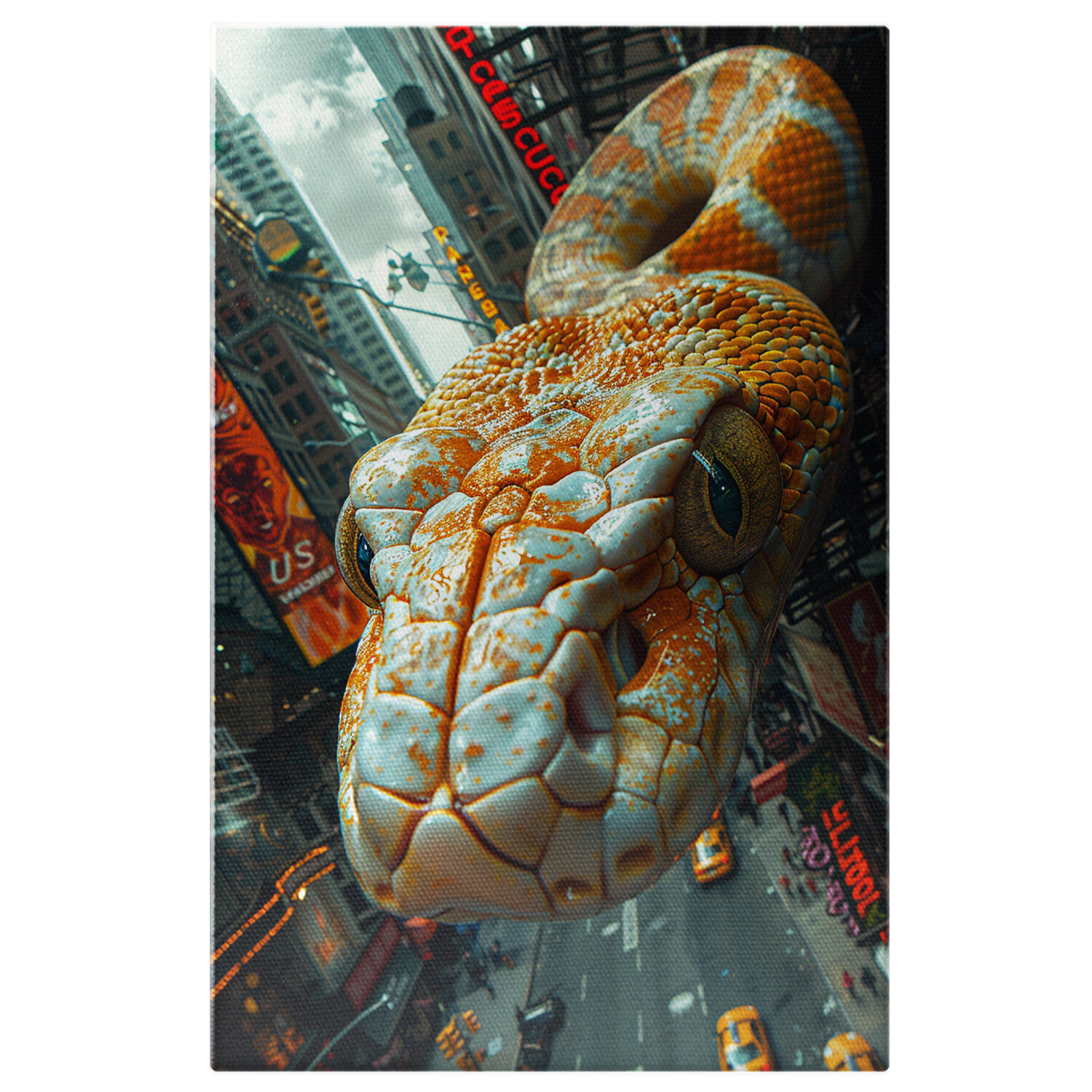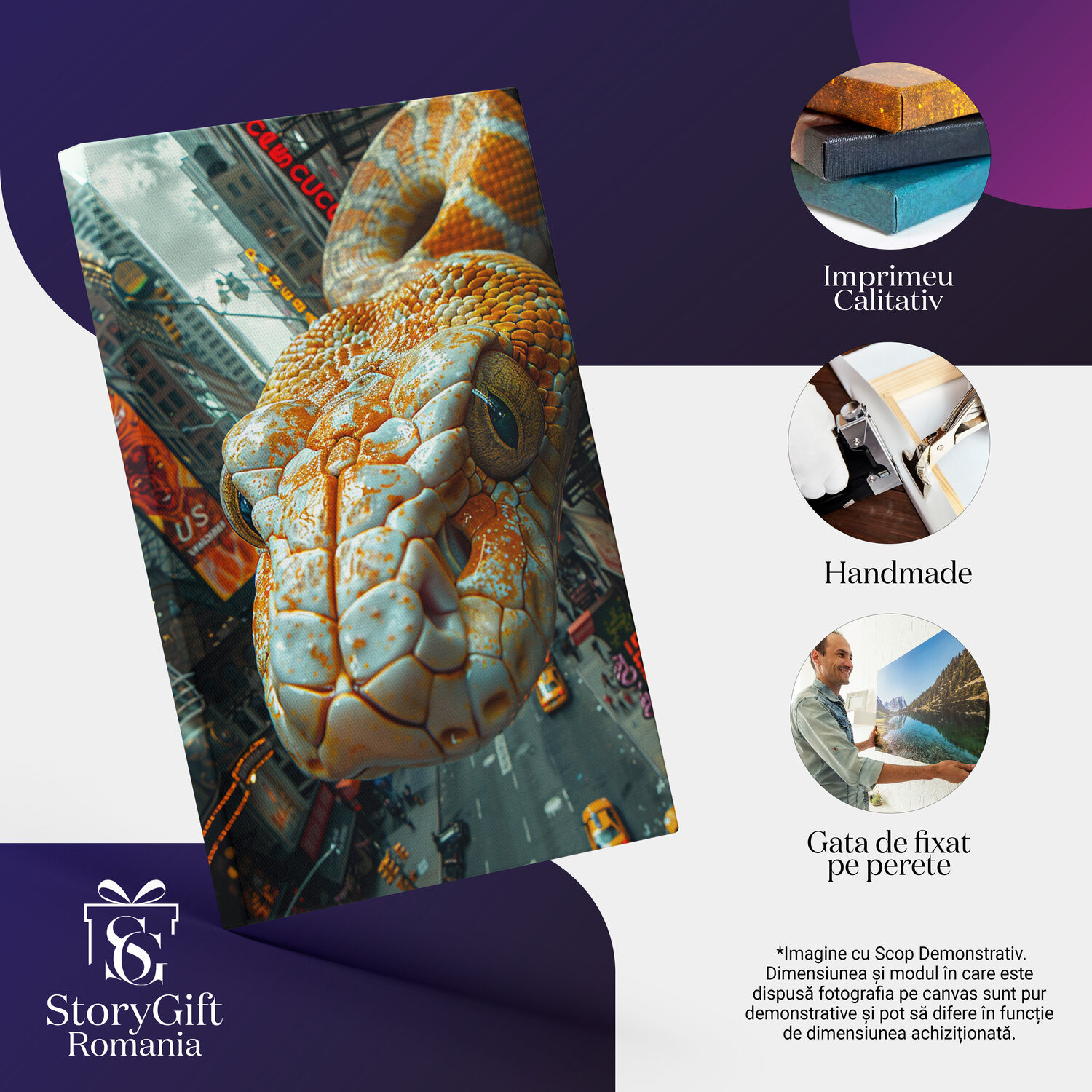 Tablou Canvas Marele Sarp Alb-Portocaliu cu Ochii Inspaimantatori care se Taraste Printre Blocuri, Fierce Snake , Pictura Digitala - Tablou Canvas Signature de la StoryGift Romania