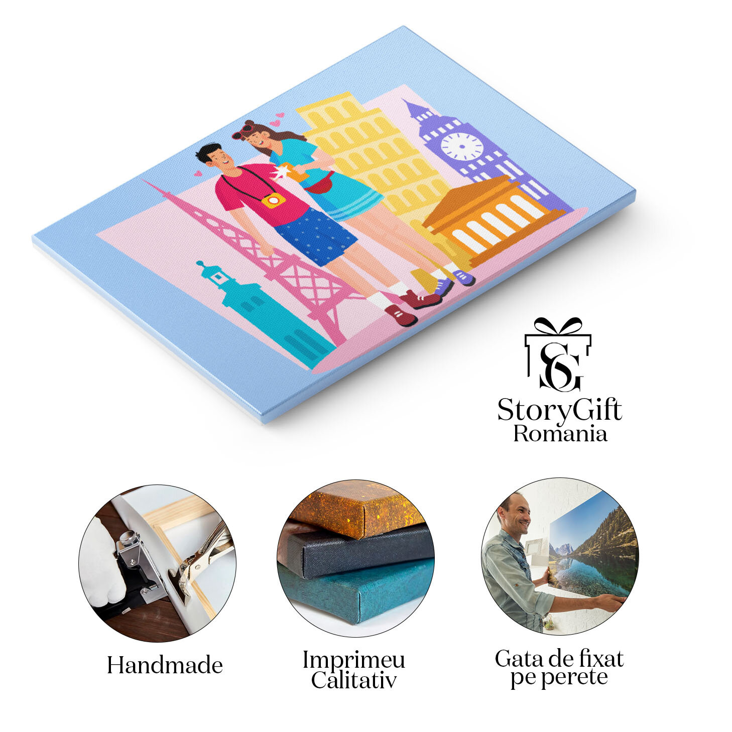 Tablou Canvas Frumosii Indragostiti Calatorind in Toata lumea cu Aparat Foto si Telefonul Mobil cu Inimioare 40x25CM