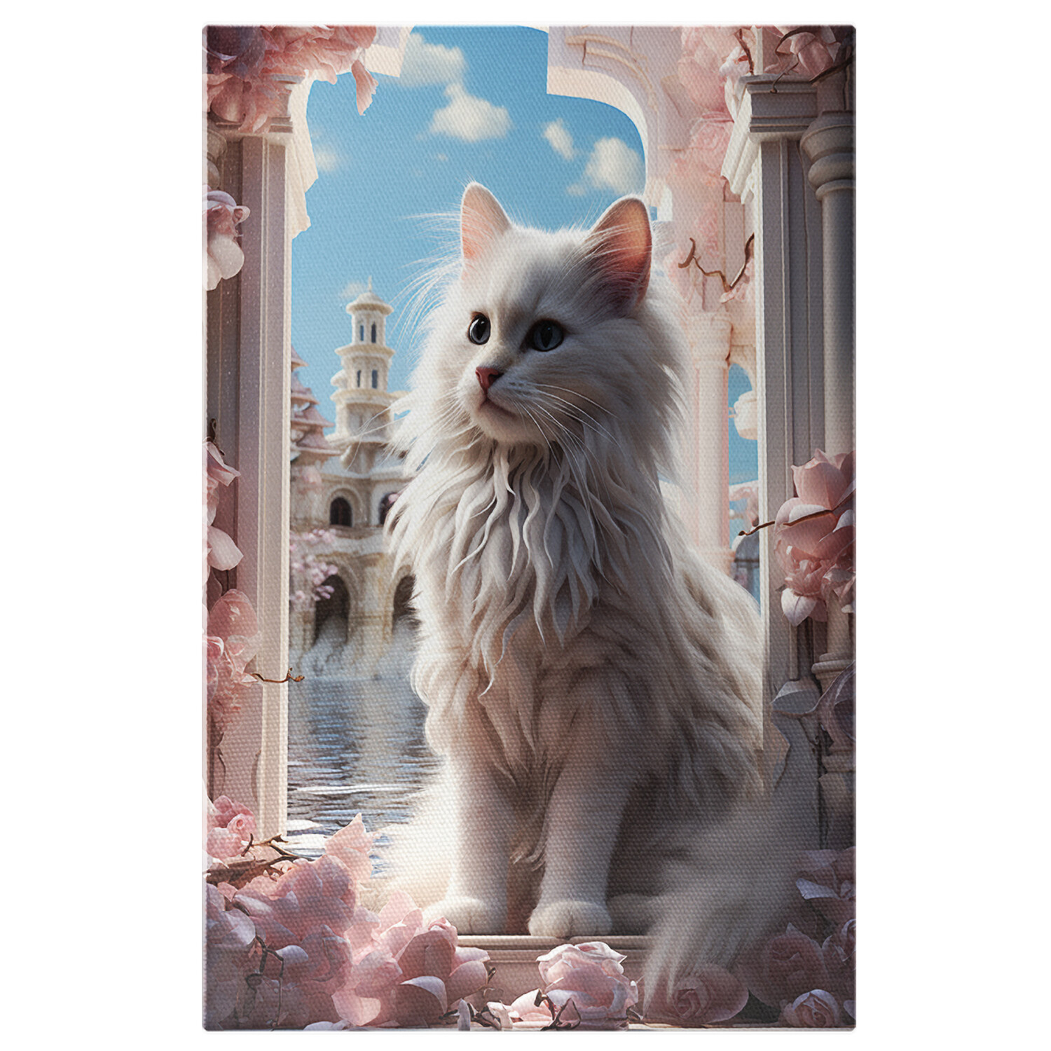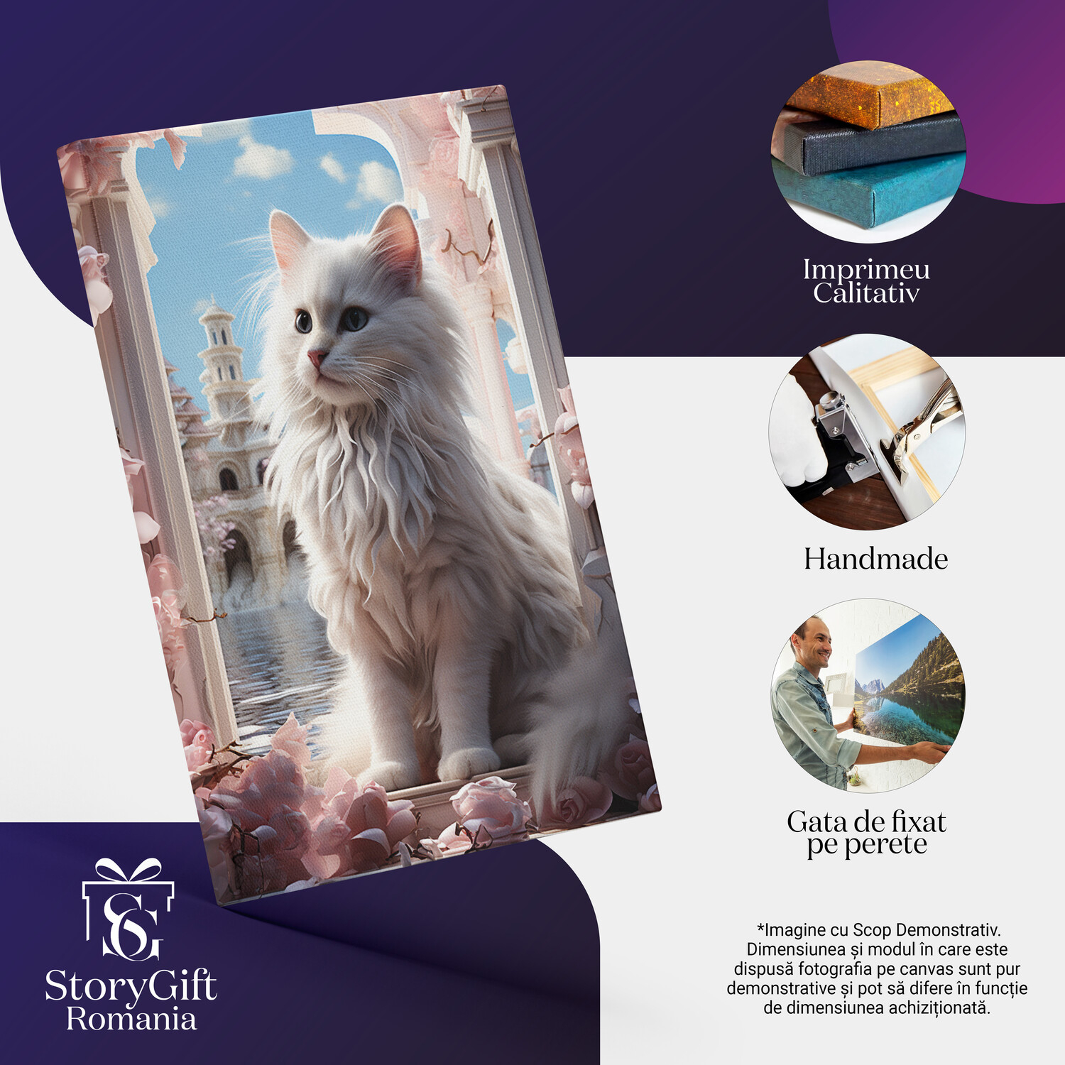 Tablou Canvas: Pisica gala intr-un spatiu roz Nor, Cer, Feastra, flori, eleganta maiestoasa Pictura Digitala - Tablou Canvas Signature de la StoryGift Romania