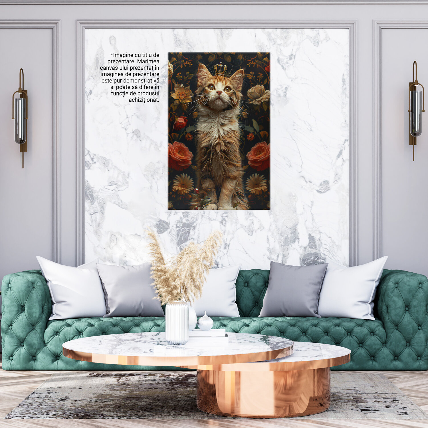 Tablou Canvas Regina Pisica cu Coroana pe Cap Incercuita de Flori cu Ochii Atenti si Blana Pufoasa Alb-Maronie , Pictura Digitala - Tablou Canvas Signature de la StoryGift Romania
