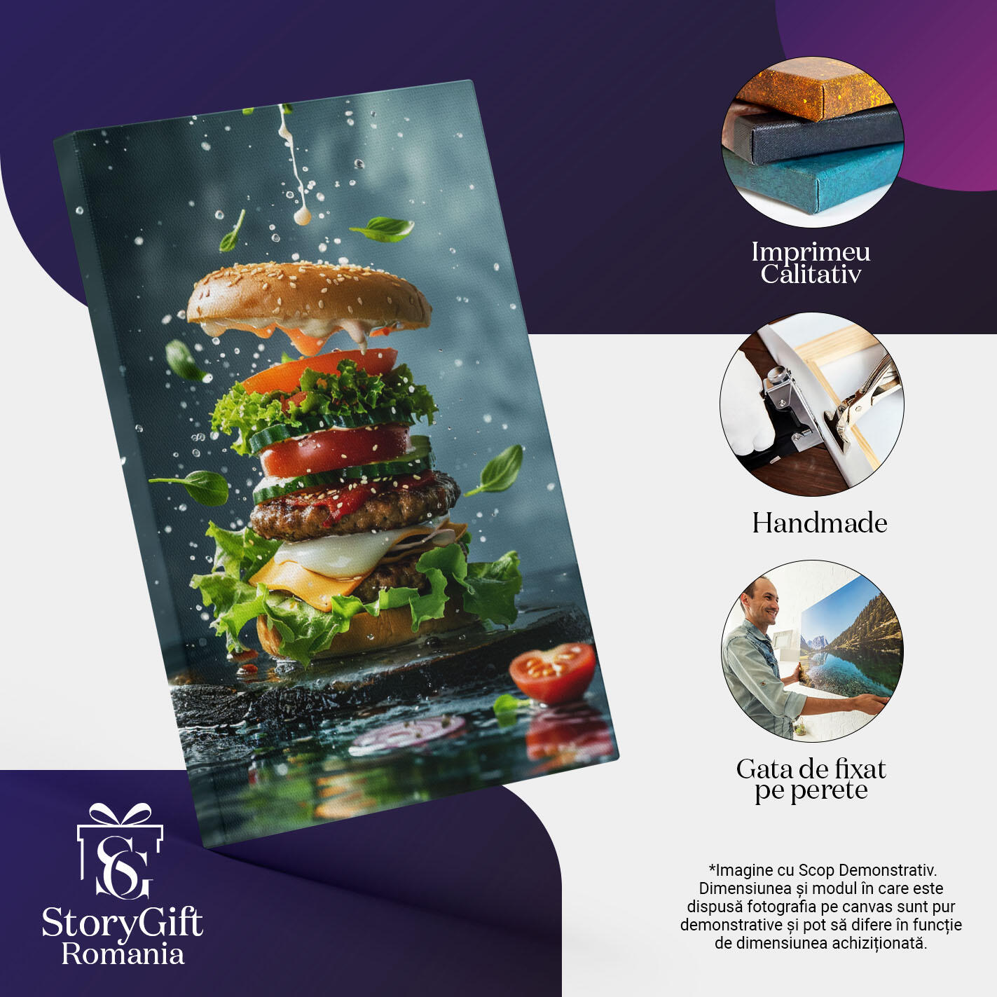 Tablou Canvas Asamblarea unui Delicios Burger pe un Platou Rotund Negru cu Sos de Maioneza Deasupra , Pictura Digitala 40x25CM