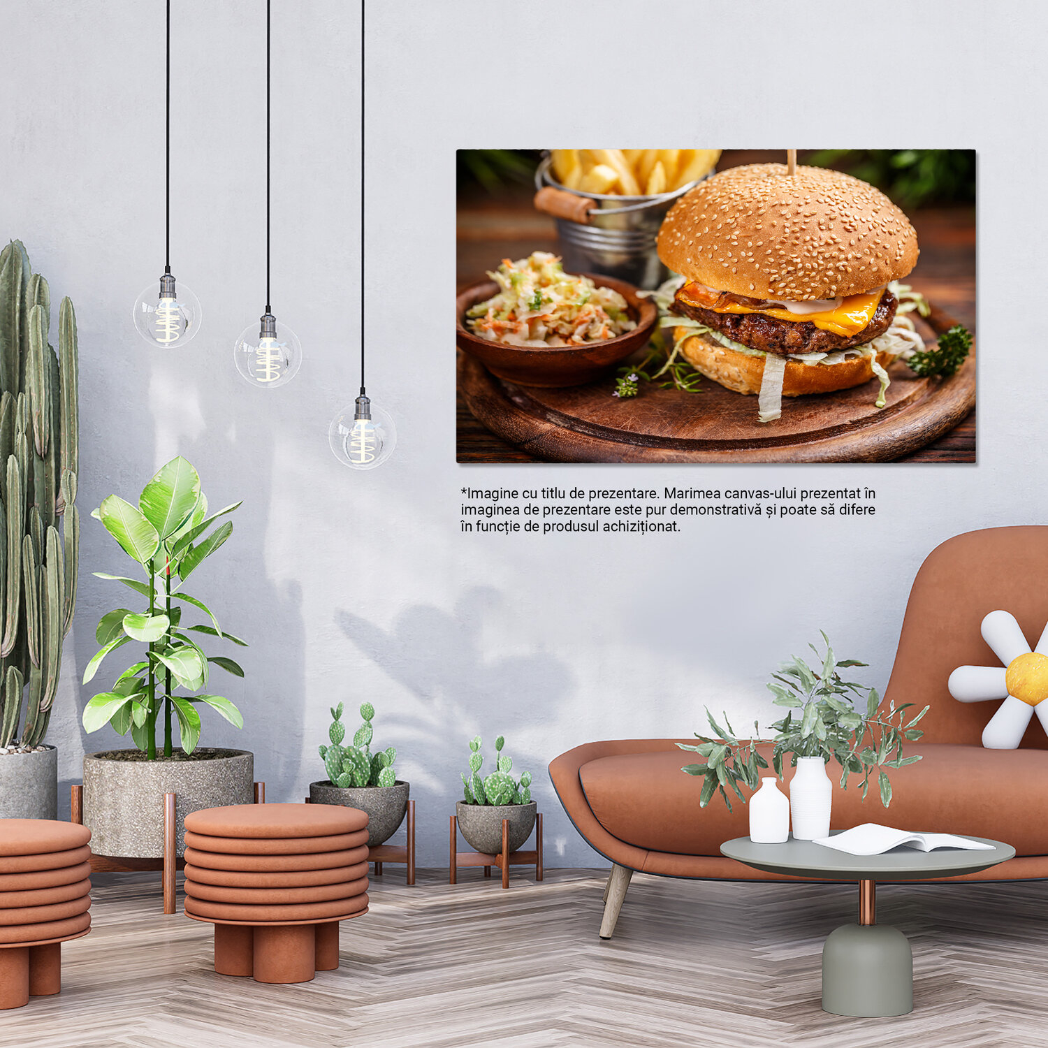Tablou Canvas: Hamburger Rustic cu Cartofi Prazii - Tasty, Beef, Fresh - Tablou Canvas Signature de la StoryGift Romania