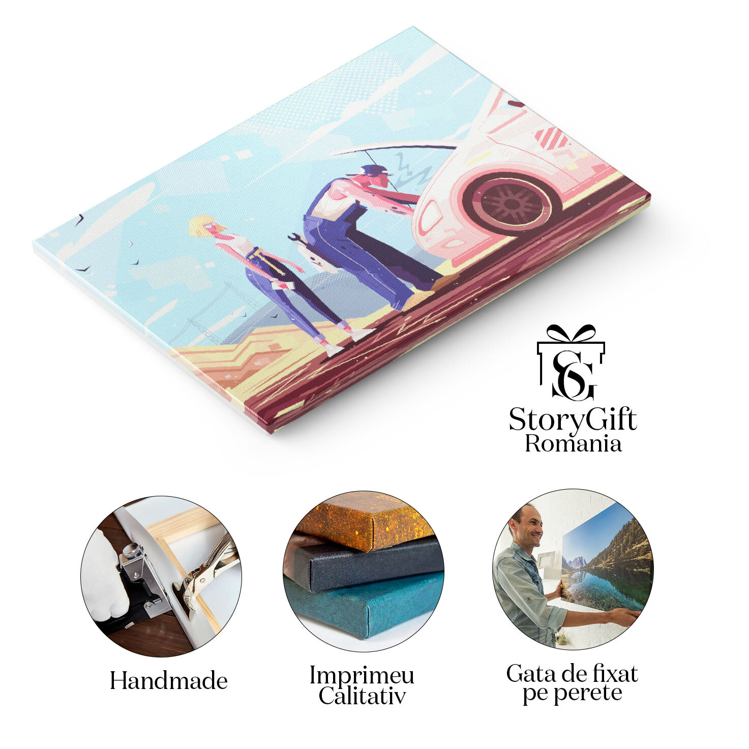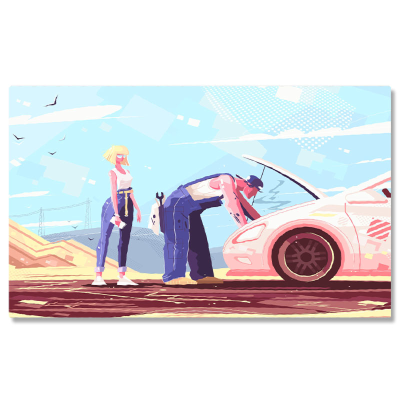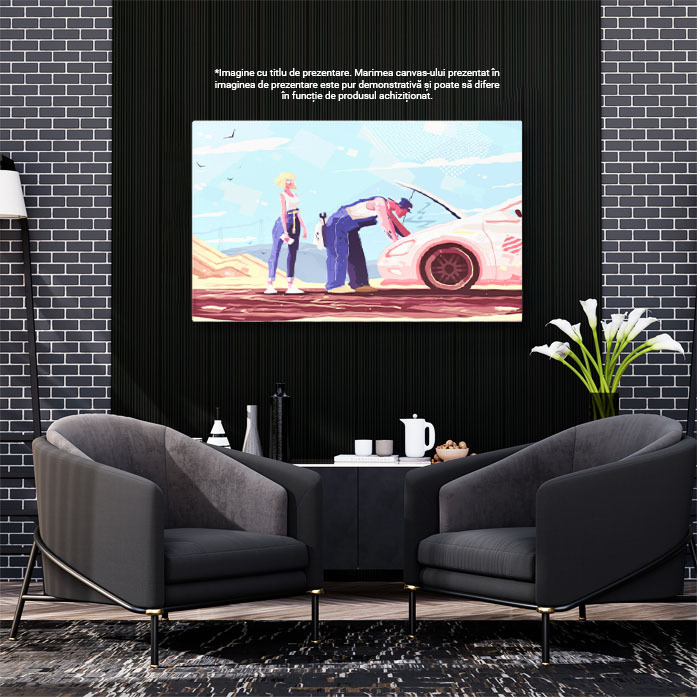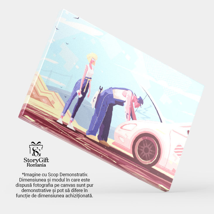 Tablou Canvas Mecanic in Salopeta Albastra care Repara o Masina Stricata pe Drum a Femeii Blonde cu Ochelari 40x25CM