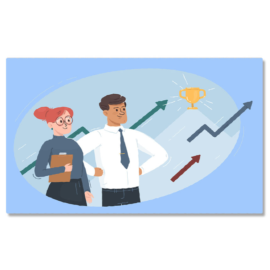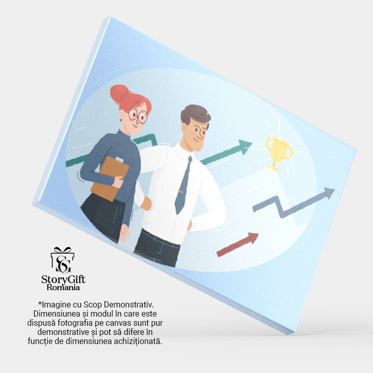 Tablou Canvas Membrii Mandrii ai Firmei la Realizarile si Profitului cu Sageti Colorate si Cupa Aurie 40x25CM