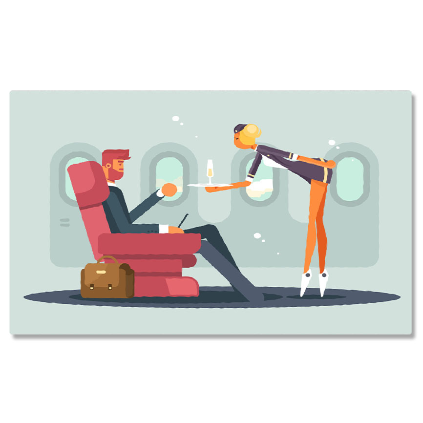 Tablou Canvas Afacerist Imbracat Elgeant Serveste un Pahar de Sampanie in Avion adus de Stewardesa Profesionista 40x25CM