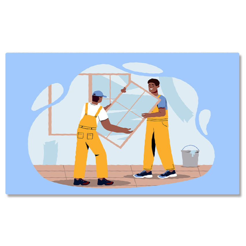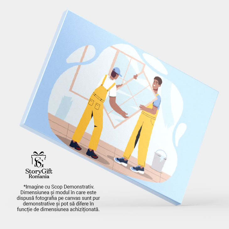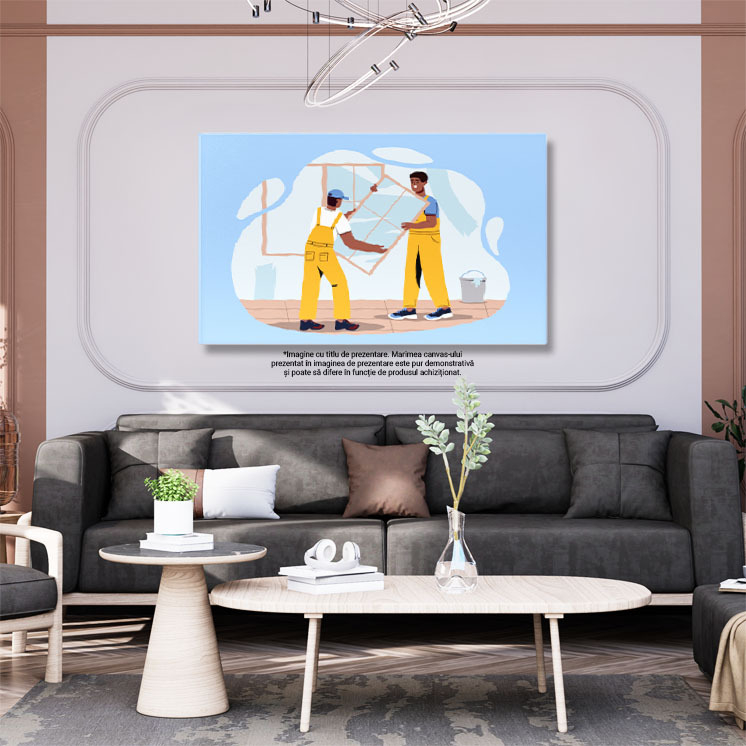 Tablou Canvas Muncitorii cu Salopete Galbene Monteaza Oglinzile pe Peretele Casei Proaspat Vopsit 40x25CM