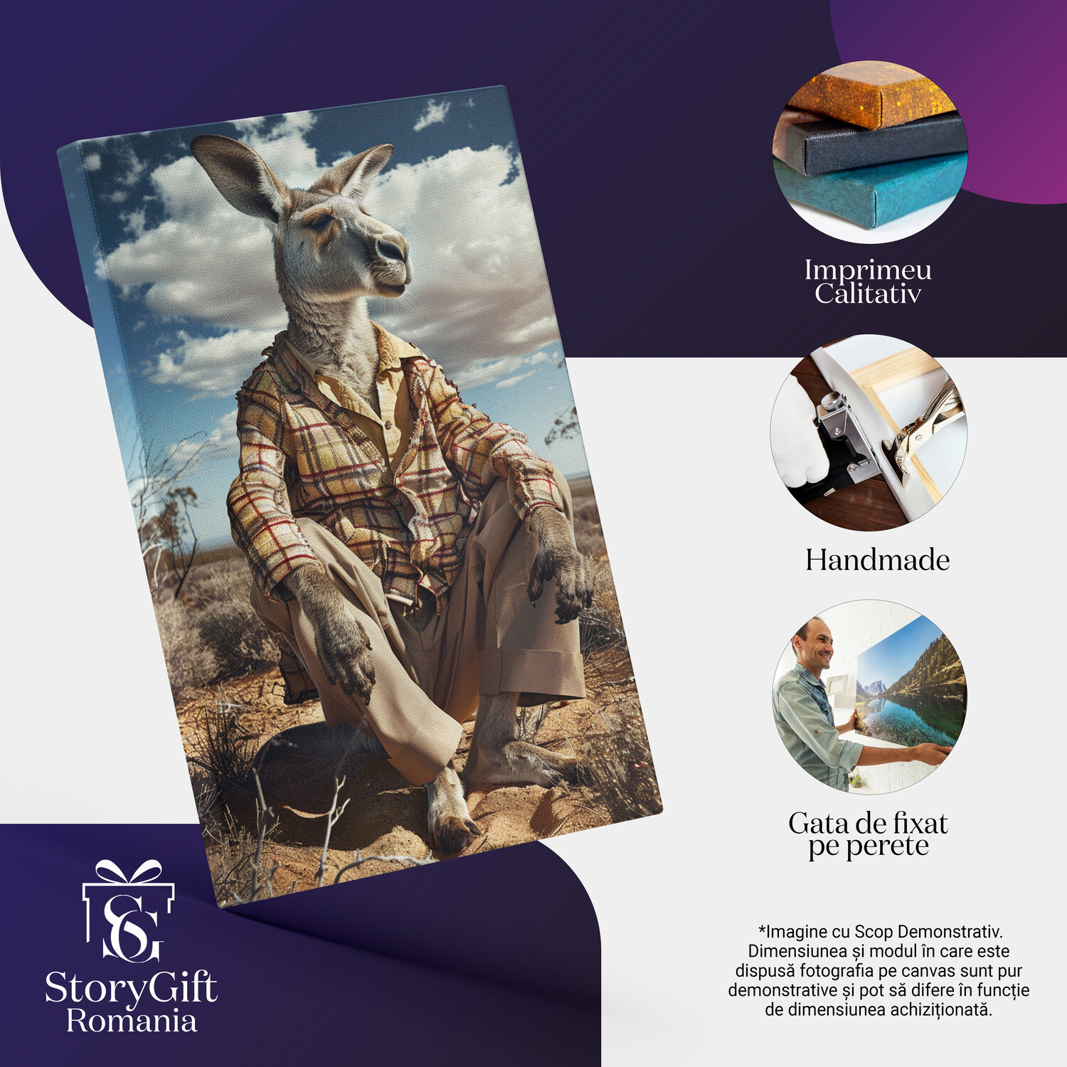 Tablou Canvas Bunicul Cangur in Camasa cu Carouri si Pantaloni Bej sta si se Odihnesc pe Pamant cu Privire Suparata , Pictura Digitala - Tablou Canvas Signature de la StoryGift Romania